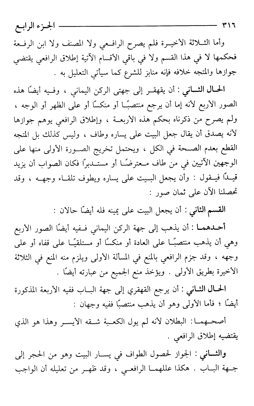 الحال الثاني: أن يرجع القهقري إلى جهة الباب ففيه الأربعة المذكورة أيضًا؛ فأما الأولى وهو أن يذهب منتصبًا ففيه وجهان: