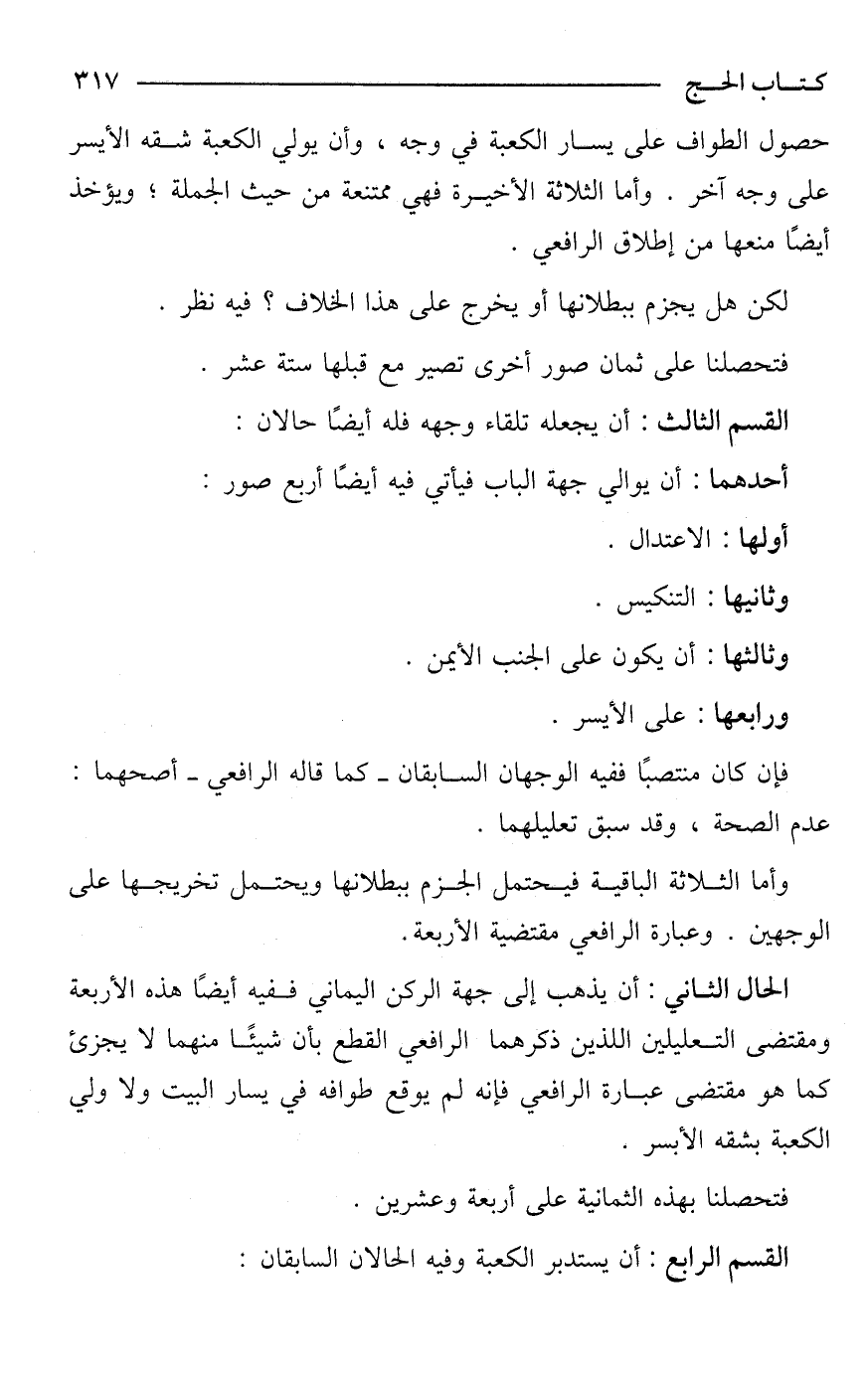 حصول الطواف على يسار الكعبة في وجه، وأن يولي الكعبة شقه الأيسر على وجه آخر. وأما الثلاثة الأخيرة فهي ممتنعة من حيث الجملة؛ ويؤخذ أيضًا منعها من إطلاق الرافعي.