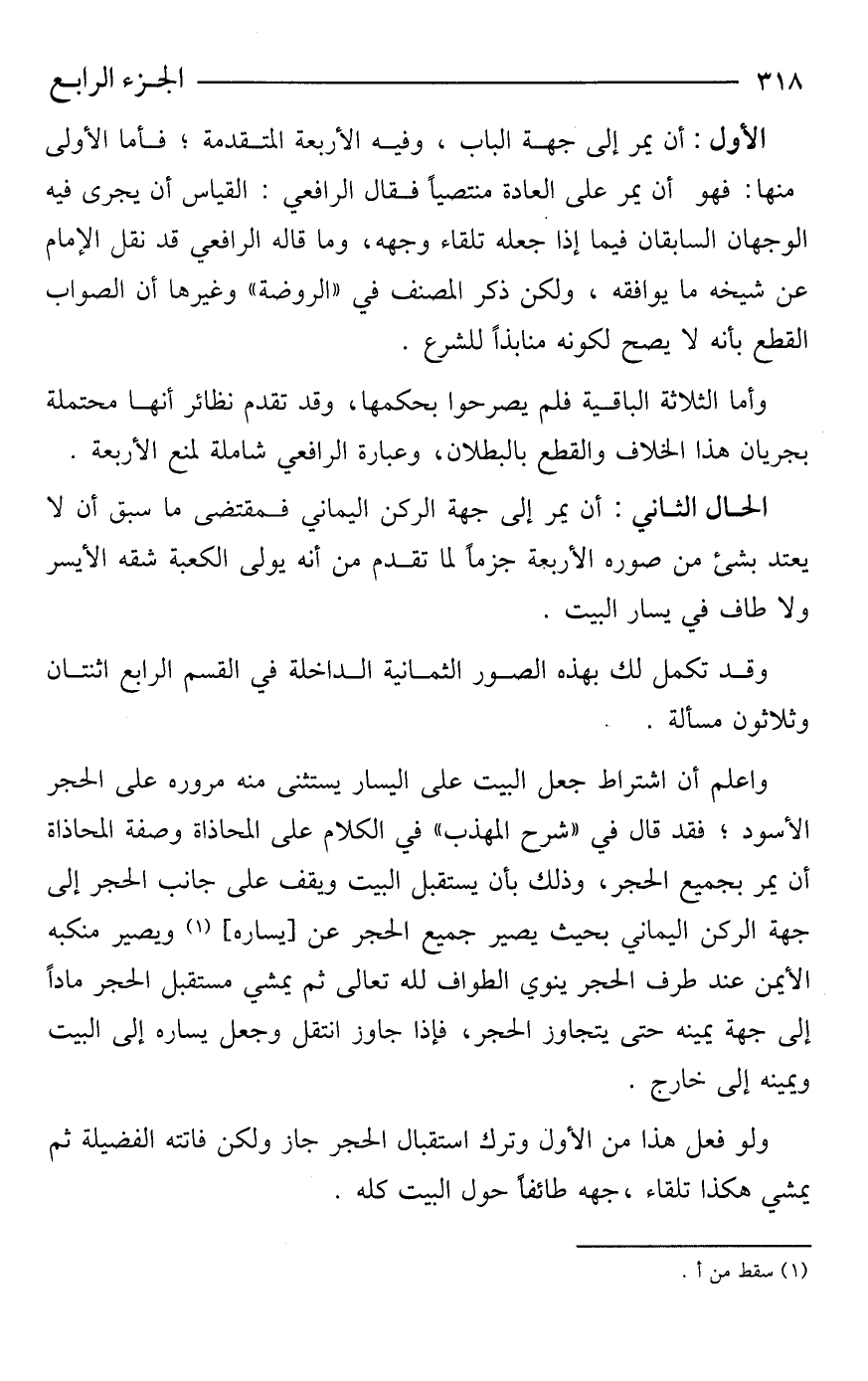 واعلم أن اشتراط جعل البيت على اليسار يستثنى منه مروره على الحجر الأسود؛ فقد قال في "شرح المهذب" في الكلام على المحاذاة وصفة المحاذاة أن يمر بجميع الحجر، وذلك بأن يستقبل البيت ويقف على جانب الحجر إلى جهة الركن اليماني بحيث يصير جميع الحجر عن [يساره] (¬1) ويصير منكبه الأيمن عند طرف الحجر ينوي الطواف لله تعالى ثم يمشي مستقبل الحجر مادًا إلى جهة يمينه حتى يتجاوز الحجر، فإذا جاوز انتقل وجعل يساره إلى البيت ويمينه إلى خارج.