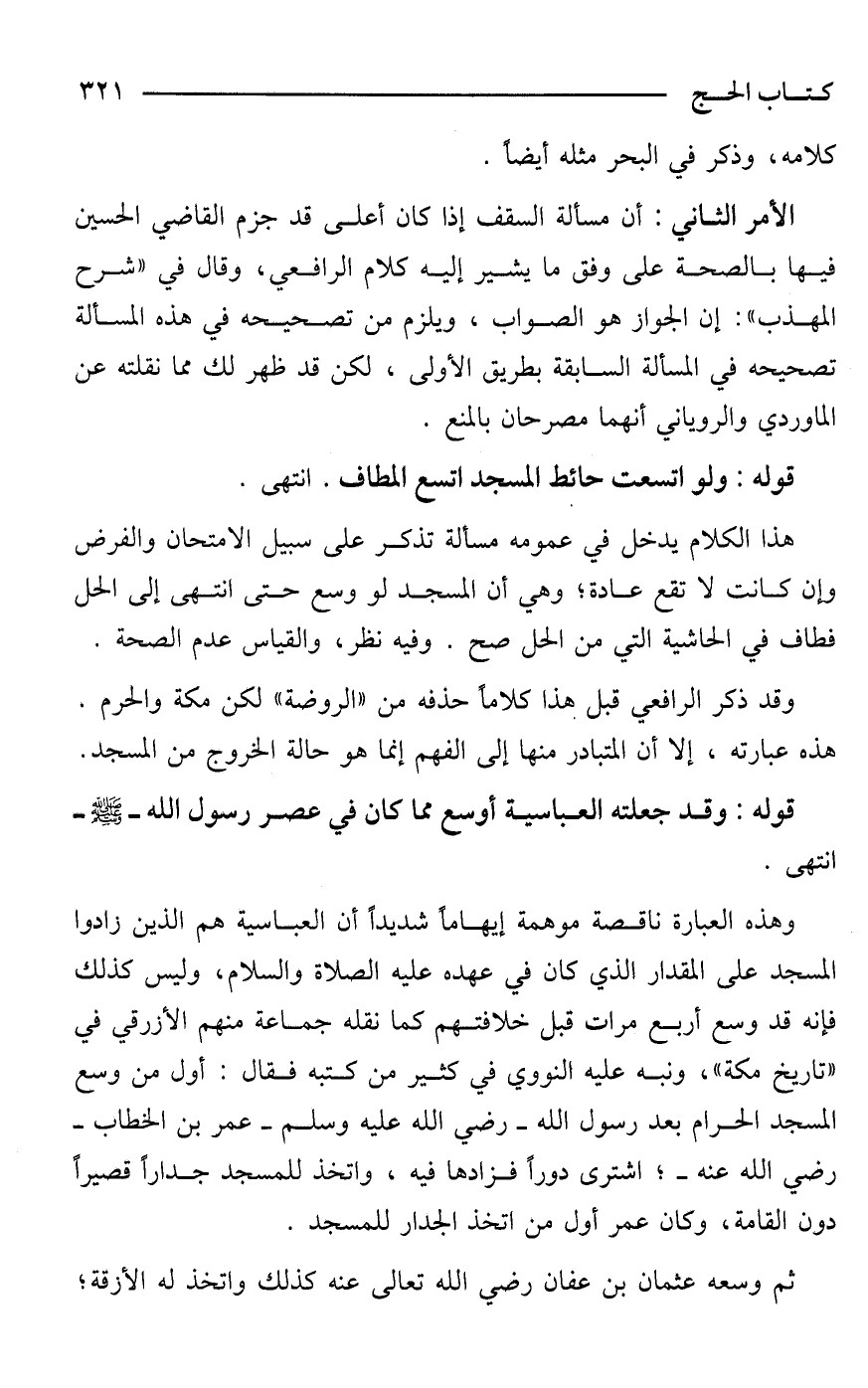 وهذه العبارة ناقصة موهمة إيهامًا شديدًا أن العباسية هم الذين زادوا المسجد على المقدار الذي كان في عهده -عليه الصلاة والسلام-، وليس كذلك فإنه قد وسع أربع مرات فبل خلافتهم كما نقله جماعة منهم الأزرقي في "تاريخ مكة"، ونبه عليه النووي في كثير من كتبه فقال: أول من وسع المسجد الحرام بعد رسول الله - صَلَّى اللَّهُ عَلَيْهِ وَسَلَّمَ - عمر بن الخطاب -رضي الله عنه-؛ اشترى دورًا فزادها فيه، واتخذ للمسجد جدارًا قصيرًا دون القامة، وكان عمر أول من اتخذ الجدار للمسجد.