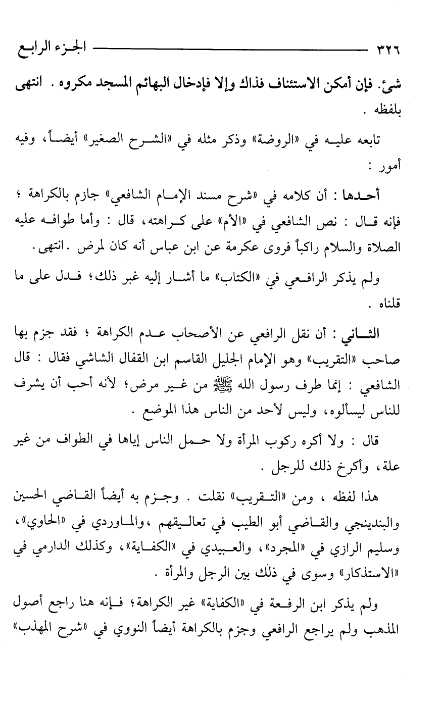 أحدها: أن كلامه في "شرح مسند الإمام الشافعي" جازم بالكراهة؛ فإنه قال: نص الشافعي في "الأم" على كراهته، قال: وأما طوافه -عليه الصلاة والسلام- راكبًا فروى عكرمة عن ابن عباس أنه كان لمرض. انتهى.