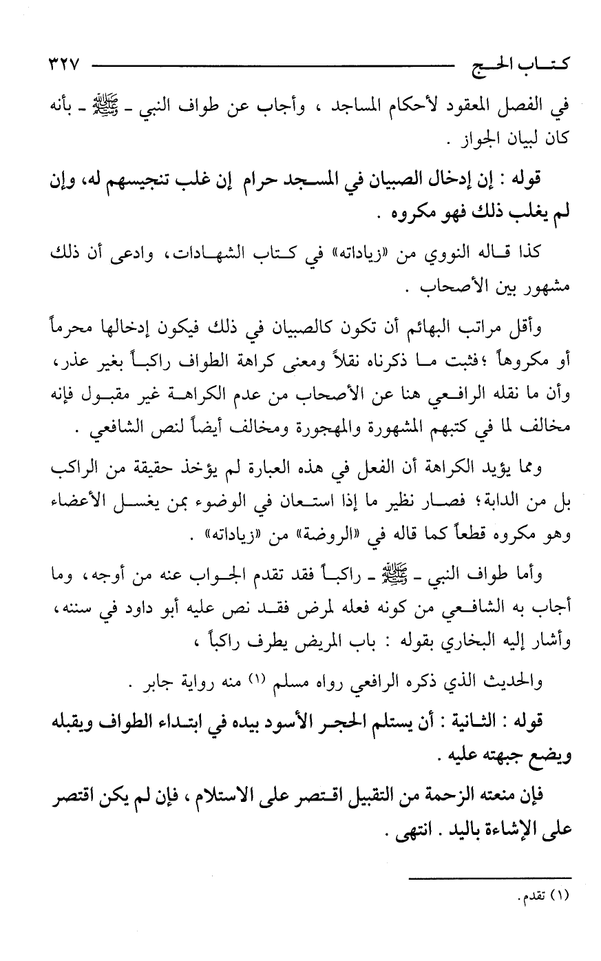 وأقل مراتب البهائم أن تكون كالصبيان في ذلك فيكون إدخالها محرمًا أو مكروهًا؛ فثبت ما ذكرناه نقلًا ومعنى كراهة الطواف راكبًا بغير عذر، وأن ما نقله الرافعي هنا عن الأصحاب من عدم الكراهة غير مقبول فإنه مخالف لما في كتبهم المشهورة والمهجورة ومخالف أيضًا لنص الشافعي.