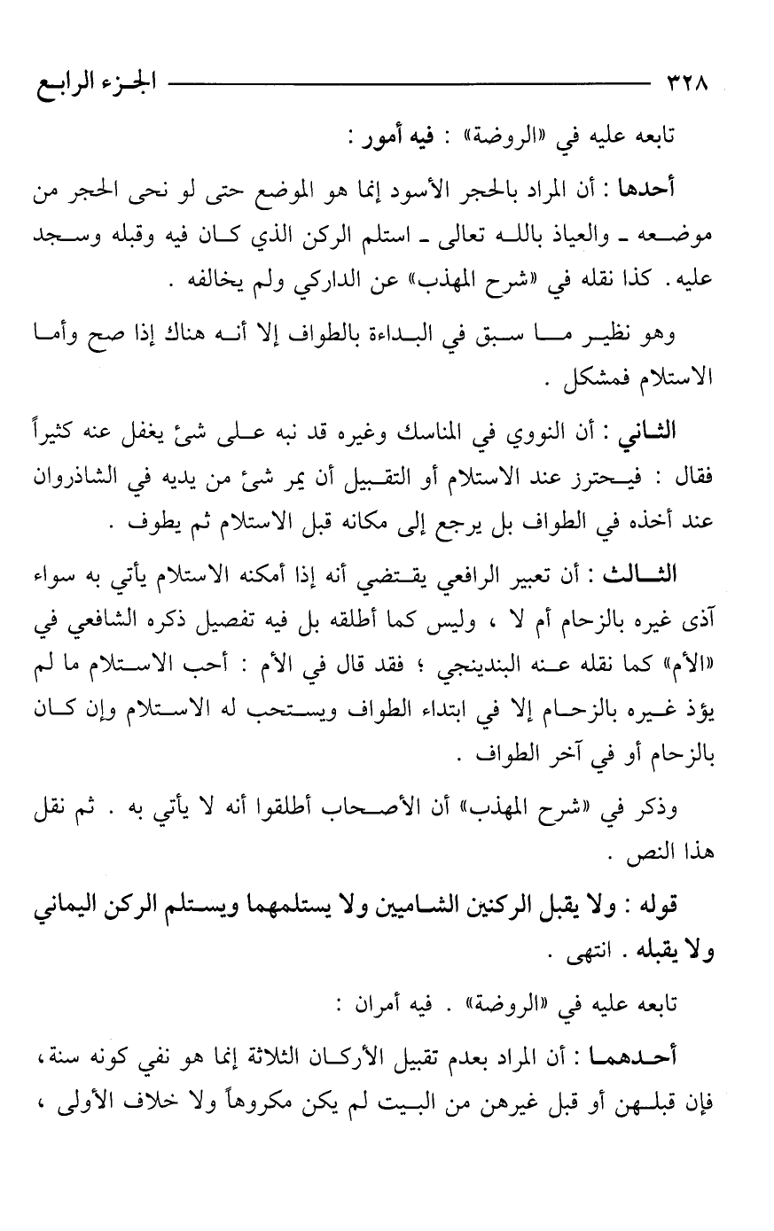 الثاني: أن النووي في المناسك وغيره قد نبه على شئ يغفل عنه كثيرًا فقال: فيحترز عند الاستلام أو التقبيل أن يمر شئ من يديه في الشاذروان عند أخذه في الطواف بل يرجع إلى مكانه قبل الاستلام ثم يطوف.
