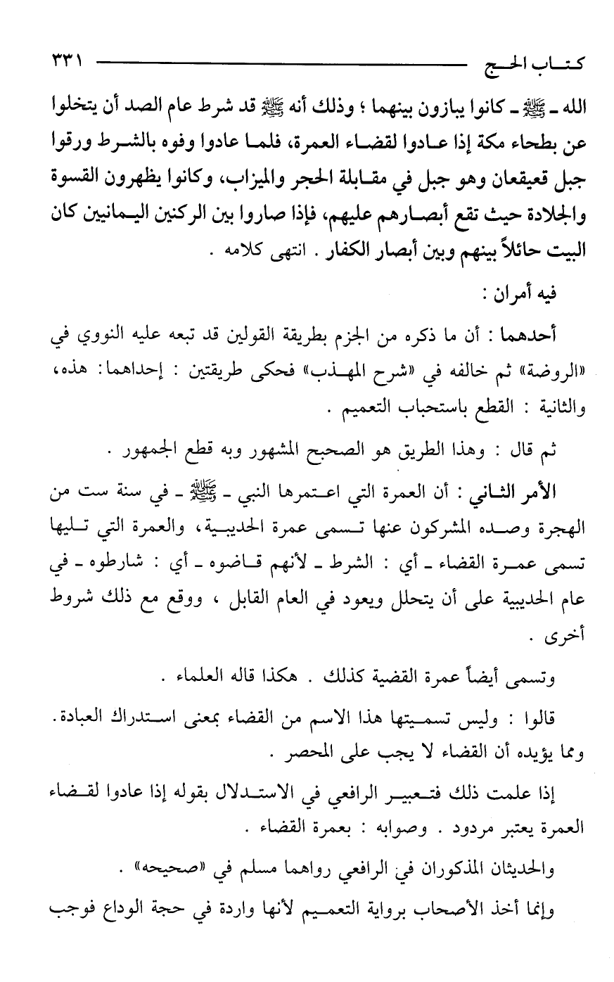 إذا علمت ذلك فتعبير الرافعي في الاستدلال بقوله إذا عادوا لقضاء العمرة يعتبر مردود. وصوابه: بعمرة القضاء.