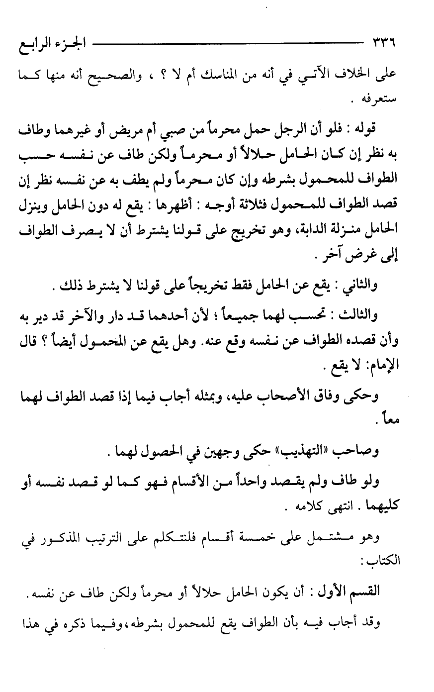 والثالث: تحسب لهما جميعًا؛ لأن أحدهما قد دار والآخر قد دير به وأن قصده الطواف عن نفسه وقع عنه. وهل يقع عن المحمول أيضًا؟ قال الإمام: لا يقع.