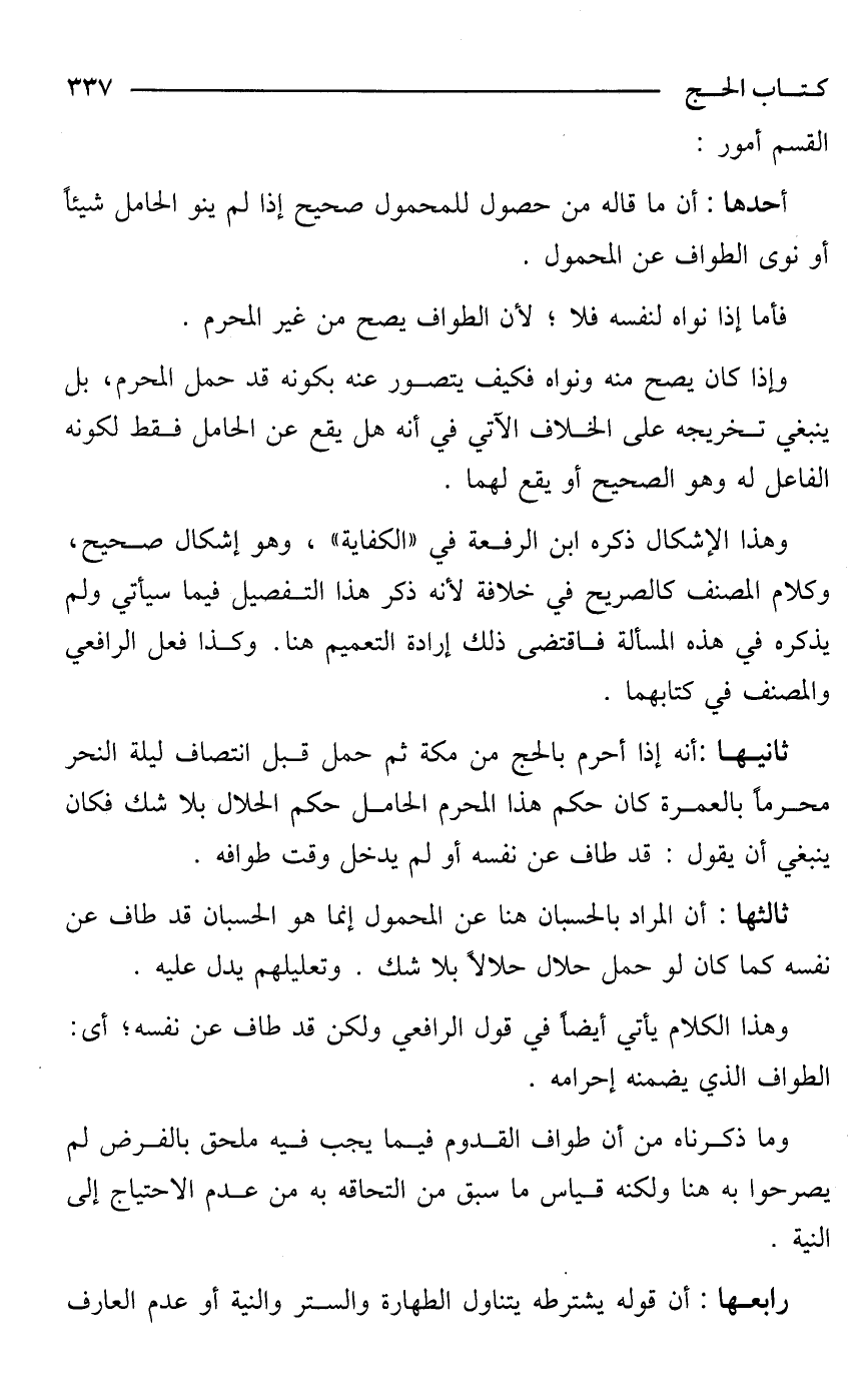 أحدها: أن ما قاله من حصول للمحمول صحيح إذا لم ينو الحامل شيئًا أو نوى الطواف عن المحمول.
