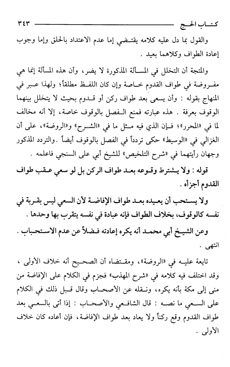 والمتجه أن التخلل في المسألة المذكورة لا يضر، وأن هذه المسألة إنما هي مفروضة في طواف القدوم خاصة وإن كان اللفظ مطلقًا؛ ولهذا عبر في المنهاج بقوله: وأن يسعى بعد طواف ركن أو قدوم بحيث لا يتخلل بينهما الوقوف بعرفة. هذه عبارته فمنع الفصل بالوقوف خاصة، إلا أنه مخالف لما في "المحرر"؛ فإن الذي فيه مثل ما في "الشرح" و"الروضة"، على أن الغزالي في "الوسيط" حكى ترددًا في الفصل بالوقوف أيضًا. والتردد المذكور وجهان رأيتهما في "شرح التلخيص" للشيخ أبي على السنجي فاعلمه.