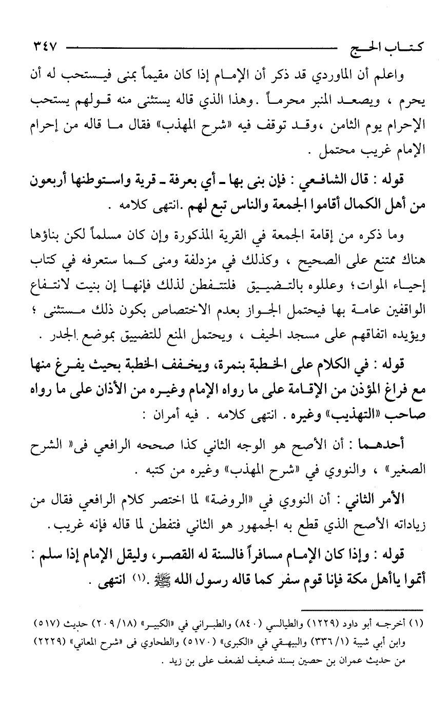 قوله: قال الشافعي: فإن بنى بها -أي بعرفة- قرية واستوطنها أربعون من أهل الكمال أقاموا الجمعة والناس تبع لهم. انتهى كلامه.