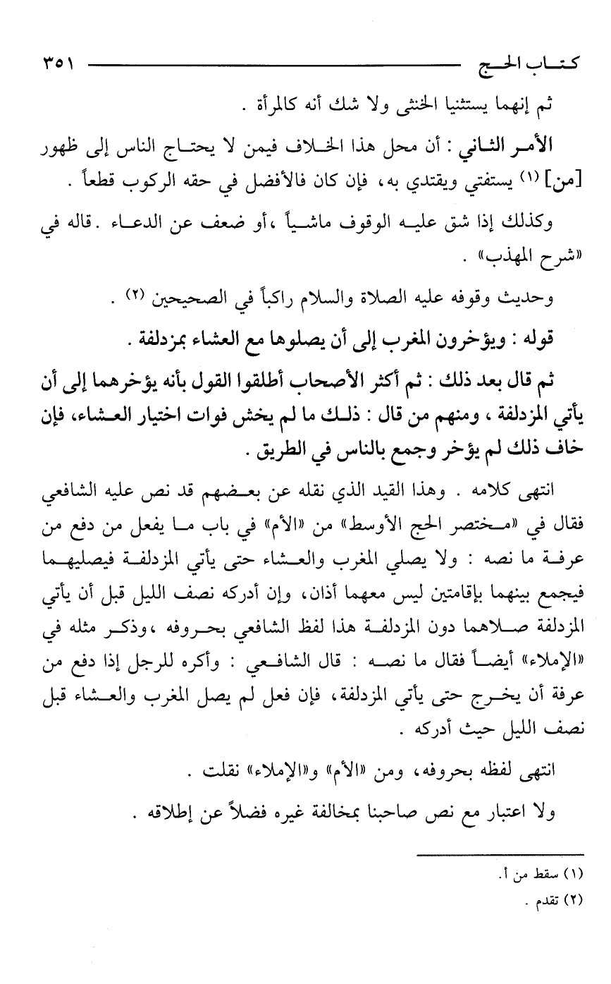 انتهى كلامه. وهذا القيد الذي نقله عن بعضهم قد نص عليه الشافعي فقال في "مختصر الحج الأوسط" من "الأم" في باب ما يفعل من دفع من عرفة ما نصه: ولا يصلي المغرب والعشاء حتى يأتي المزدلفة فيصليهما فيجمع بينهما بإقامتين ليس معهما أذان، وإن أدركه نصف الليل قبل أن يأتي المزدلفة صلاهما دون المزدلفة هذا لفظ الشافعي بحروفه، وذكر مثله في "الإملاء" أيضًا فقال ما نصه: قال الشافعي: وأكره للرجل إذا دفع من عرفة أن يخرج حتى يأتي المزدلفة، فإن فعل لم يصل المغرب والعشاء قبل نصف الليل حيث أدركه.