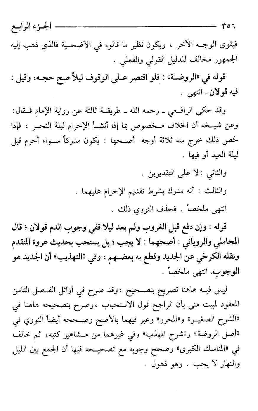قوله: وإن دفع قبل الغروب ولم يعد ليلًا ففي وجوب الدم قولان؛ قال المحاملي والروياني: أصحهما: لا يجب؛ بل يستحب بحديث عروة المتقدم ونقله الكرخي عن الجديد وقطع به بعضهم، وفي "التهذيب" أن الجديد هو الوجوب. انتهى ملخصًا.