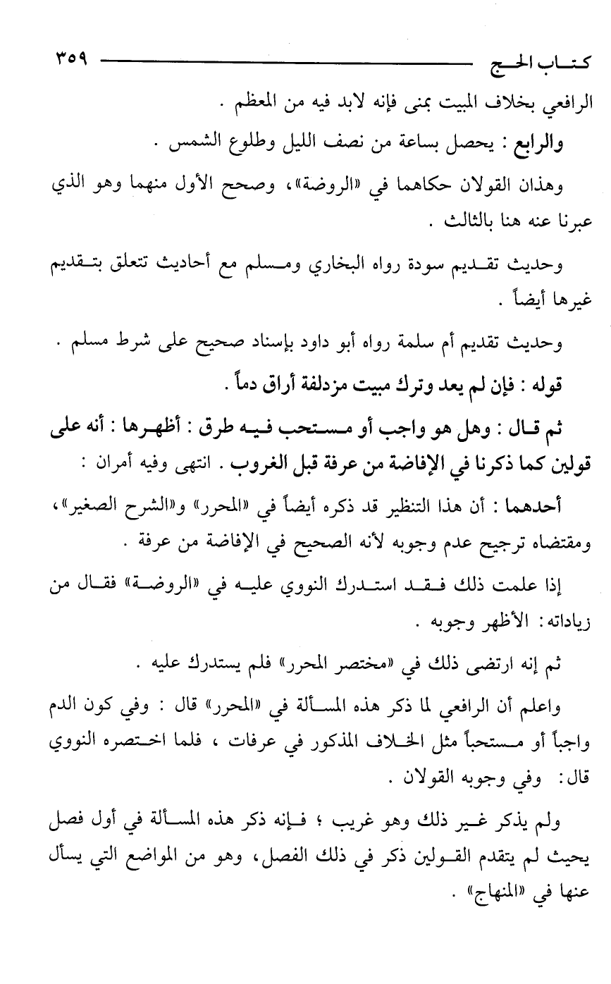 أحدهما: أن هذا التنظير قد ذكره أيضًا في "المحرر" و"الشرح الصغير"، ومقتضاه ترجيح عدم وجوبه لأنه الصحيح في الإفاضة من عرفة.