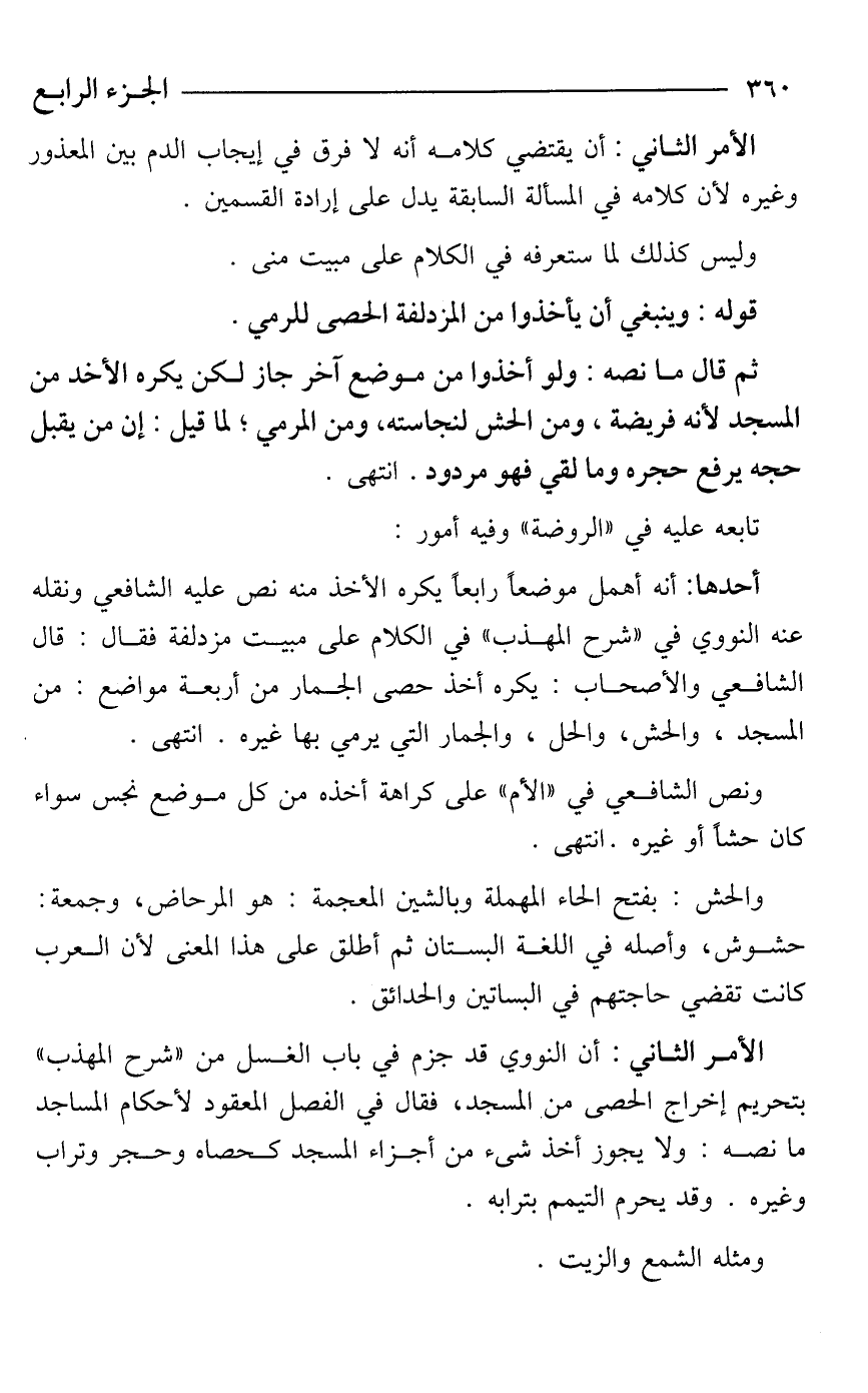 الأمر الثاني: أن النووي قد جزم في باب الغسل من "شرح المهذب" بتحريم إخراج الحصى من المسجد، فقال في الفصل المعقود لأحكام المساجد ما نصه: ولا يجوز أخذ شيء من أجزاء المسجد كحصاه وحجر وتراب وغيره. وقد يحرم التيمم بترابه.