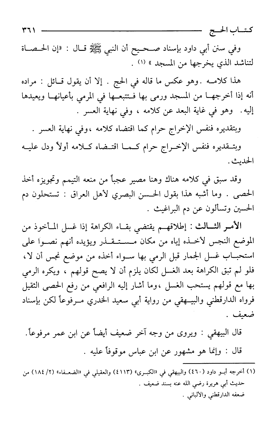 الأمر الثالث: إطلاقهم يقتضي بقاء الكراهة إذا غسل المأخوذ من الموضع النجس لأخذه إياه من مكان مستقذر ويؤيده أنهم نصوا على استحباب غسل الجمار قبل الرمي بها سواء أخذه من موضع نجس أم لا، فلو لم تبق الكراهة بعد الغسل لكان يلزم أن لا يصح قولهم، ويكره الرمي بها مع قولهم يستحب الغسل، وما أشار إليه الرافعي من رفع الحصى الثقيل فرواه الدارقطني والبيهقي من رواية أبي سعيد الخدري مرفوعًا لكن بإسناد ضعيف.