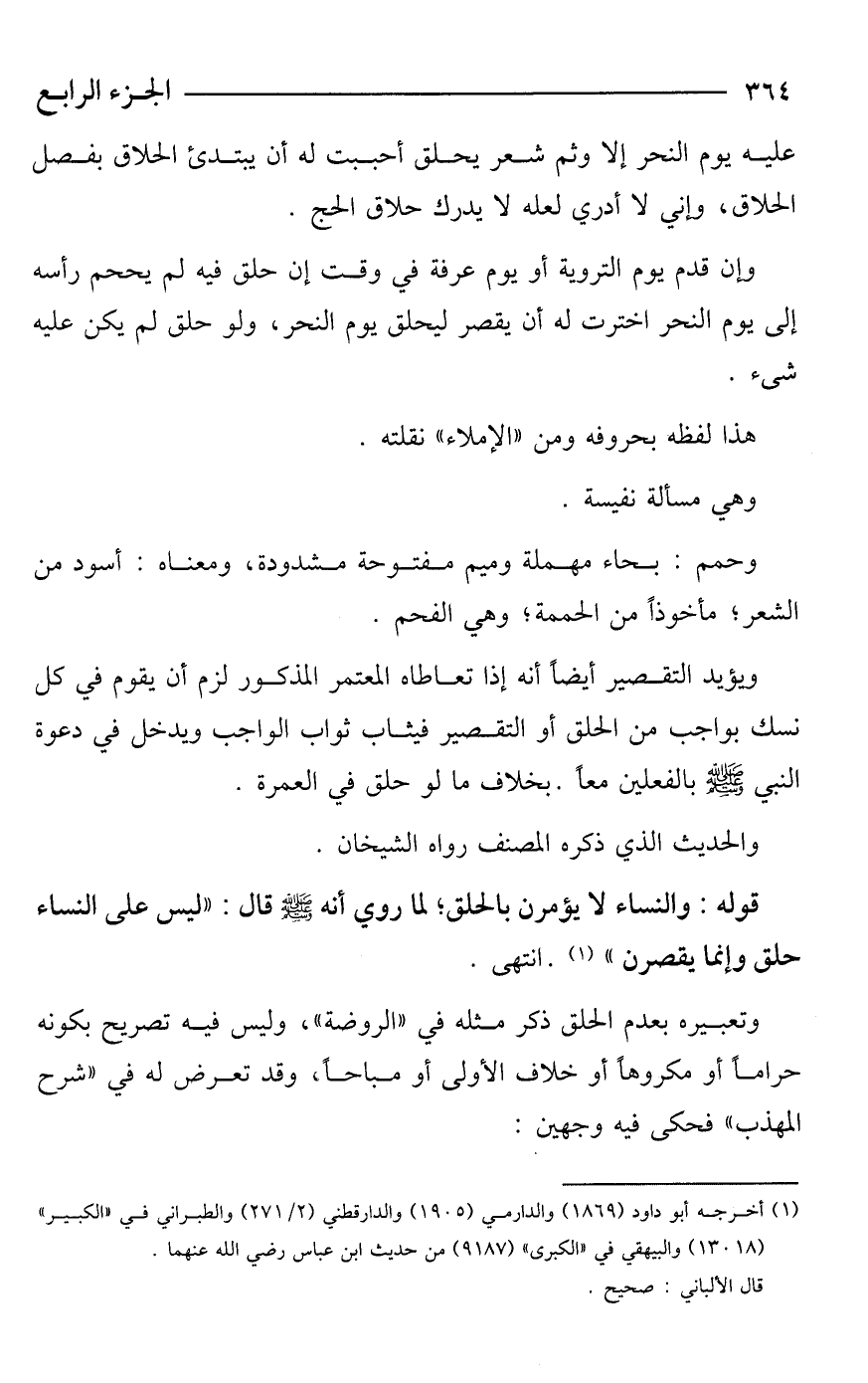 ويؤيد التقصير أيضًا أنه إذا تعاطاه المعتمر المذكور لزم أن يقوم في كل نسك بواجب من الحلق أو التقصير فيثاب ثواب الواجب ويدخل في دعوة النبي - صَلَّى اللَّهُ عَلَيْهِ وَسَلَّمَ - بالفعلين معًا. بخلاف ما لو حلق في العمرة.