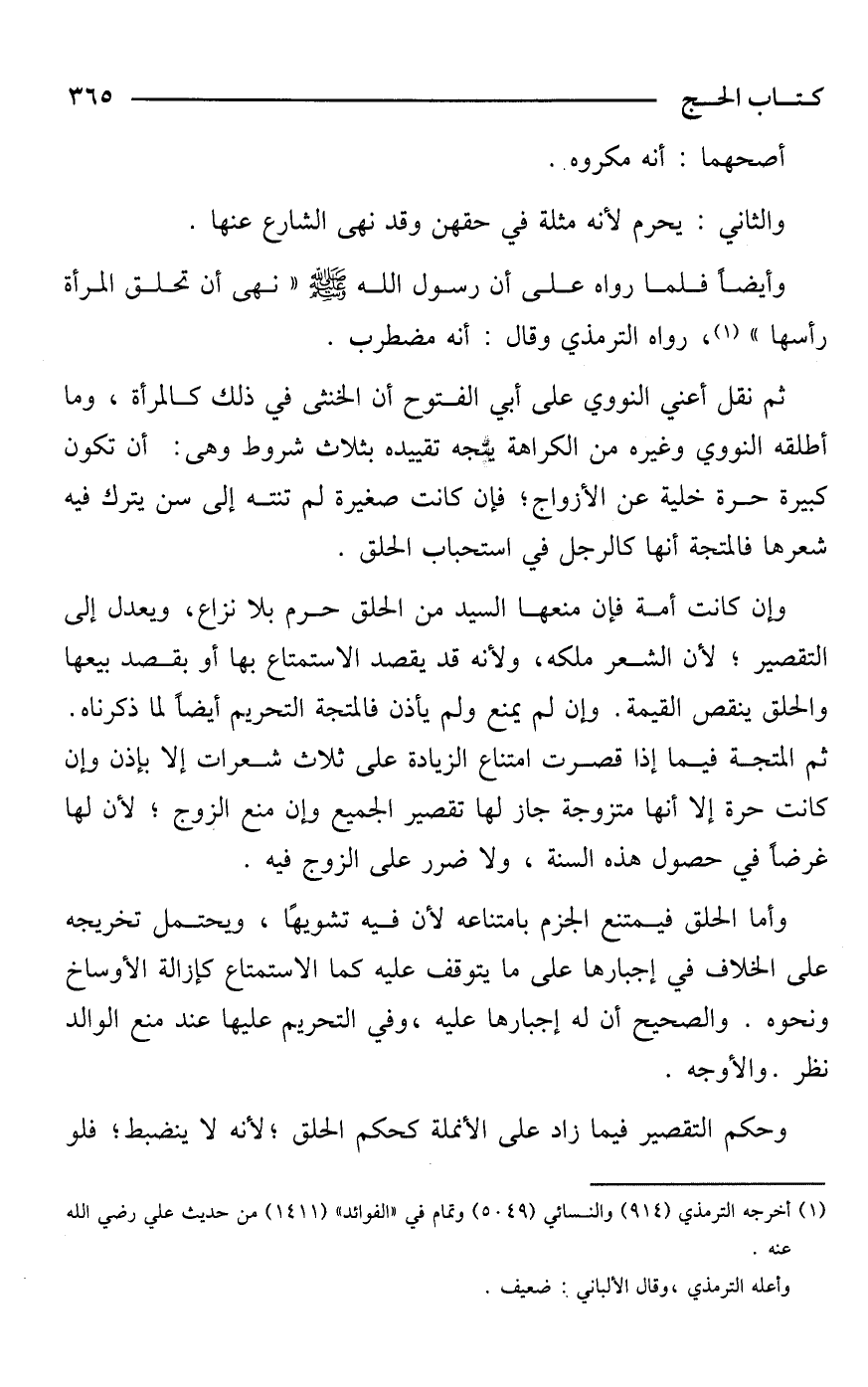 ثم نقل أعني النووي على أبي الفتوح أن الخنثى في ذلك كالمرأة، وما أطلقه النووي وغيره من الكراهة يتجه تقييده بثلاث شروط وهي: أن تكون كبيرة حرة خلية عن الأزواج؛ فإن كانت صغيرة لم تنته إلى سن يترك فيه شعرها فالمتجه أنها كالرجل في استحباب الحلق.