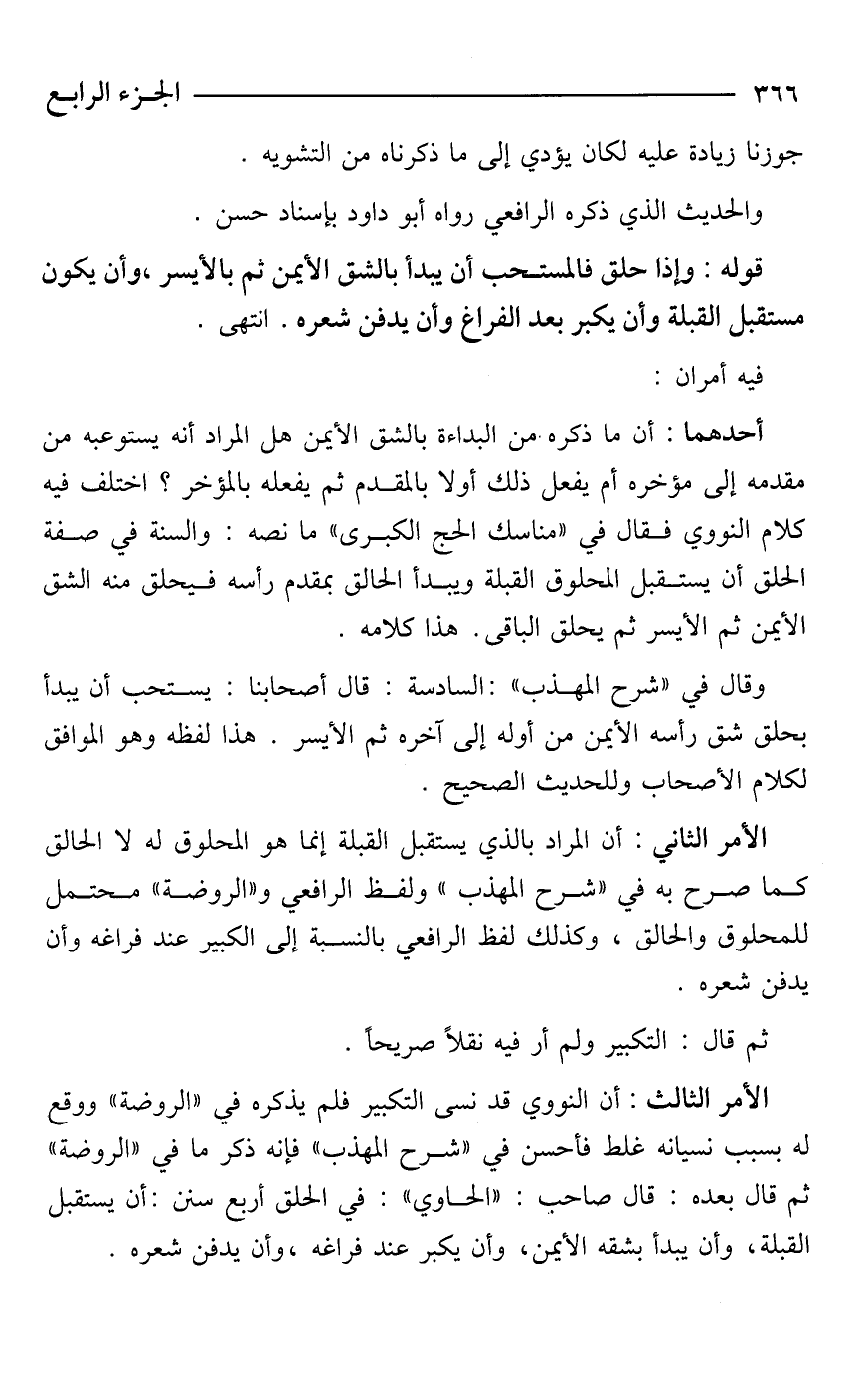 الأمر الثالث: أن النووي قد نسى التكبير فلم يذكره في "الروضة" ووقع له بسبب نسيانه غلط فأحسن في "شرح المهذب" فإنه ذكر ما في "الروضة" ثم قال بعده: قال صاحب: "الحاوي": في الحلق أربع سنن: أن يستقبل القبلة، وأن يبدأ بشقه الأيمن، وأن يكبر عند فراغه، وأن يدفن شعره.