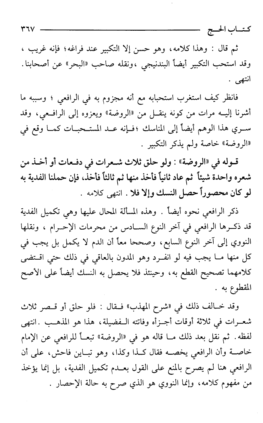 قوله في "الروضة": ولو حلق ثلاث شعرات في دفعات أو أخذ من شعره واحدة شيئًا ثم عاد ثانيًا فأخذ منها ثم ثالثًا فأخذ، فإن حملنا الفدية به لو كان محصورًا حصل النسك وإلا فلا. انتهى كلامه.