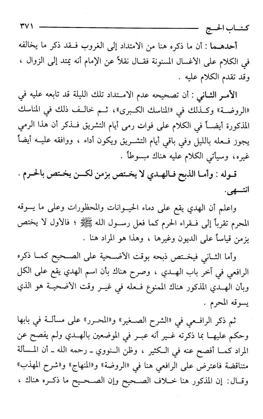 ثم ذكر الرافعي في "الشرح الصغير" و"المحرر" على مسألة في بابها وحكم عليها بما ذكرته غير أنه عبر في الموضعين بالهدي ولم يفصح عن المراد كما أفصح عنه في الكثير، وظن النووي -رحمه الله- أن المسألة متناقضة فاعترض على الرافعي هنا في "الروضة" و"المنهاج" و"شرح المهذب" وقال: إن المذكور هنا خلاف الصحيح وإن الصحيح ما ذكره هناك،