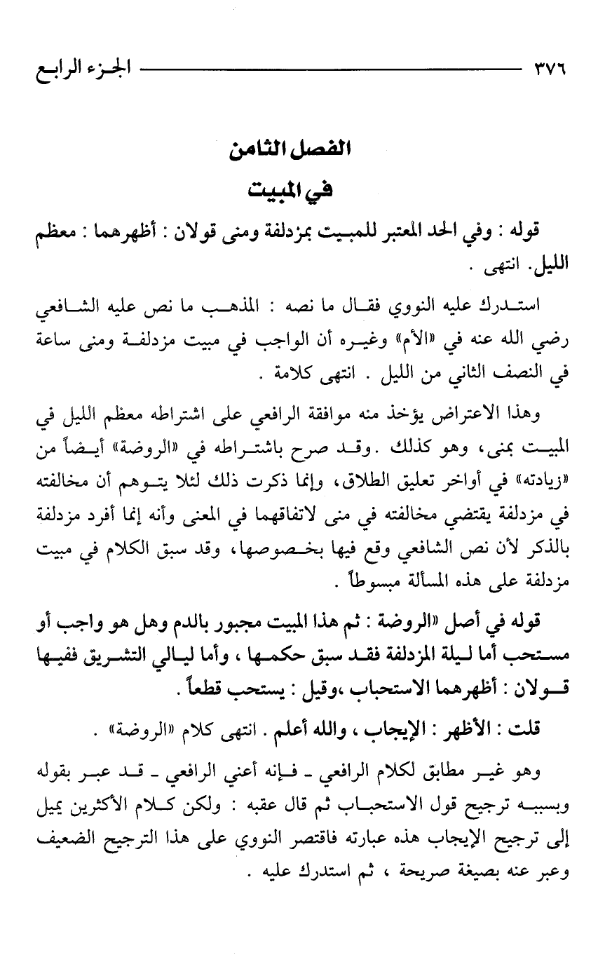 استدرك عليه النووي فقال ما نصه: المذهب ما نص عليه الشافعي - رضي الله عنه - في "الأم" وغيره أن الواجب في مبيت مزدلفة ومنى ساعة في النصف الثاني من الليل. انتهى كلامه.