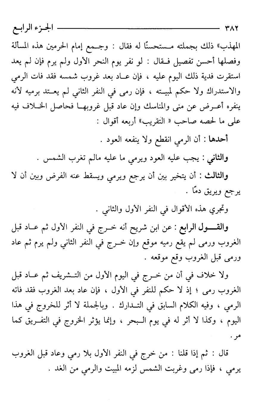 المهذب" ذلك بجملته مستحسنًا له فقال: وجمع إمام الحرمين هذه المسألة وفصلها أحسن تفصيل فقال: لو نفر يوم النحر الأول ولم يرم فإن لم يعد استقرت فدية ذلك اليوم عليه، فإن عاد بعد غروب شمسه فقد فات الرمي والاستدراك ولا حكم لمبيته، فإن رمى في النفر الثاني لم يعتد برميه لأنه ينفره أعرض عن منى والمناسك وإن عاد قبل غروبها فحاصل الخلاف فيه على ما لخصه صاحب "التقريب" أربعة أقوال: