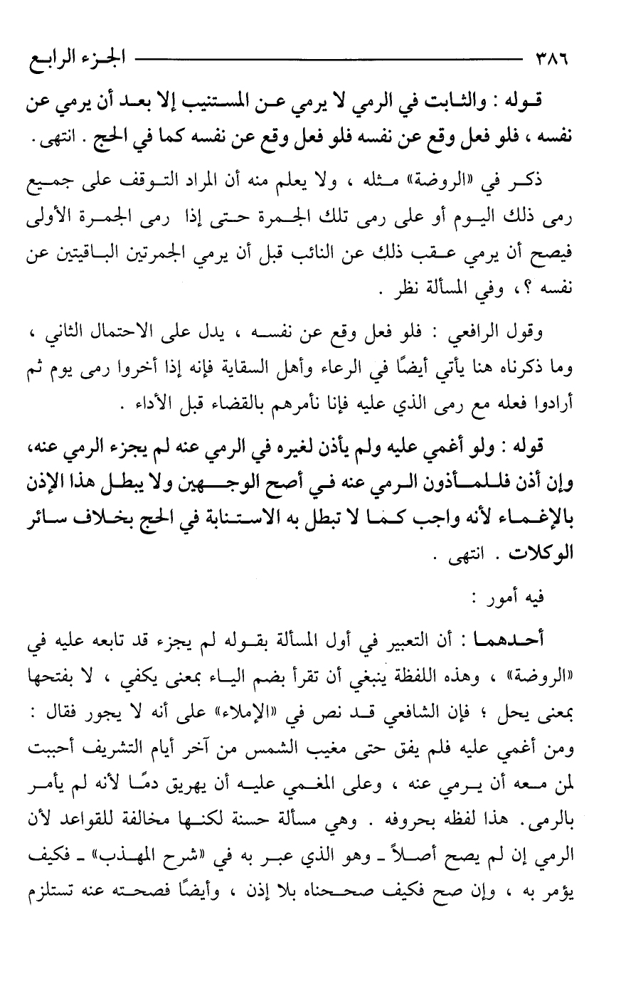 أحدهما: أن التعبير في أول المسألة بقوله لم يجزء قد تابعه عليه في "الروضة"، وهذه اللفظة ينبغي أن تقرأ بضم الياء بمعنى يكفي، لا بفتحها بمعنى يحل؛ فإن الشافعي قد نص في "الإملاء" على أنه لا يجوز فقال: ومن أغمي عليه فلم يفق حتى مغيب الشمس من آخر أيام التشريف أحببت لمن معه أن يرمي عنه، وعلى المغمي عليه أن يهريق دمًا لأنه لم يأمر بالرمى. هذا لفظه بحروفه. وهي مسألة حسنة لكنها مخالفة للقواعد لأن الرمي إن لم يصح أصلًا -وهو الذي عبر به في "شرح المهذب"- فكيف يؤمر به، وإن صح فكيف صححناه بلا إذن، وأيضًا فصحته عنه تستلزم