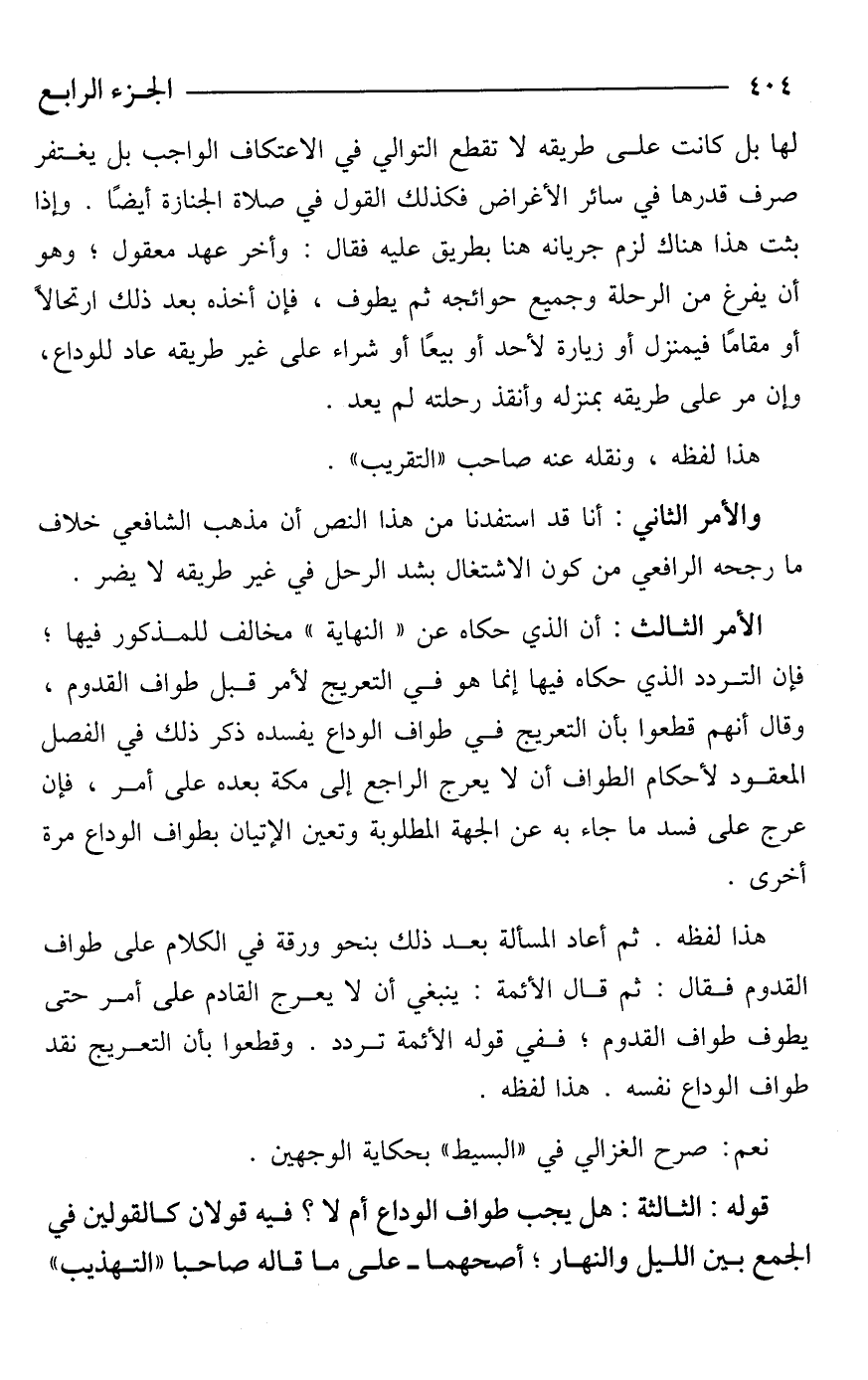 الأمر الثالث: أن الذي حكاه عن "النهاية" مخالف للمذكور فيها؛ فإن التردد الذي حكاه فيها إنما هو في التعريج لأمر قبل طواف القدوم، وقال أنهم قطعوا بأن التعريج في طواف الوداع يفسده ذكر ذلك في الفصل المعقود لأحكام الطواف أن لا يعرج الراجع إلى مكة بعده على أمر، فإن عرج على [أمر] (*) فسد ما جاء به عن الجهة المطلوبة وتعين الإتيان بطواف الوداع مرة أخرى.