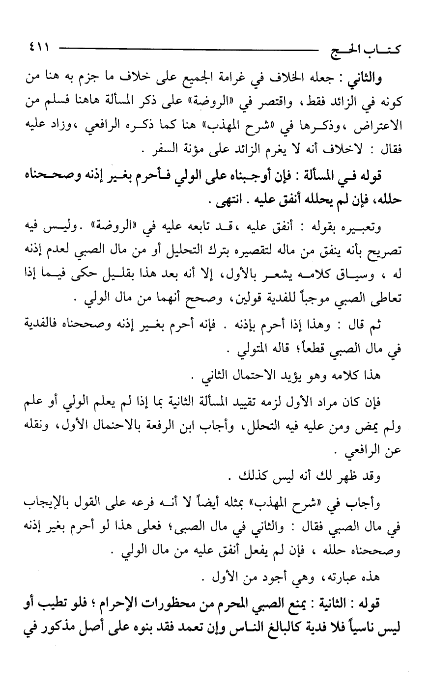 وأجاب في "شرح المهذب" بمثله أيضًا لا أنه فرعه على القول بالإيجاب في مال الصبي فقال: والثاني في مال الصبى؛ فعلى هذا لو أحرم بغير إذنه وصححناه حلله، فإن لم يفعل أنفق عليه من مال الولي.