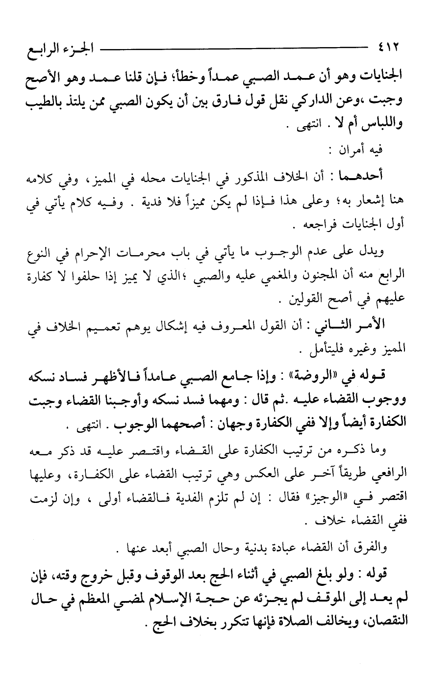 الجنايات وهو أن عمد الصبي عمدًا وخطأ، فإن قلنا عمد وهو الأصح وجبت، وعن الداركي نقل قول فارق بين أن يكون الصبي ممن يلتذ بالطيب واللباس أم لا. انتهى.