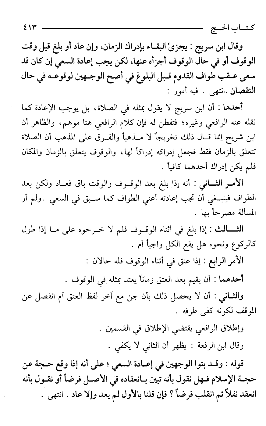 وقال ابن سريج: يجزئ البقاء بإدراك الزمان، وإن عاد أو بلغ قبل وقت الوقوف أو في حال الوقوف أجزأه عنها، لكن يجب إعادة السعي إن كان قد سعى عقب طواف القدوم قبل البلوغ في أصح الوجهين لوقوعه في حال النقصان. انتهى. فيه أمور: