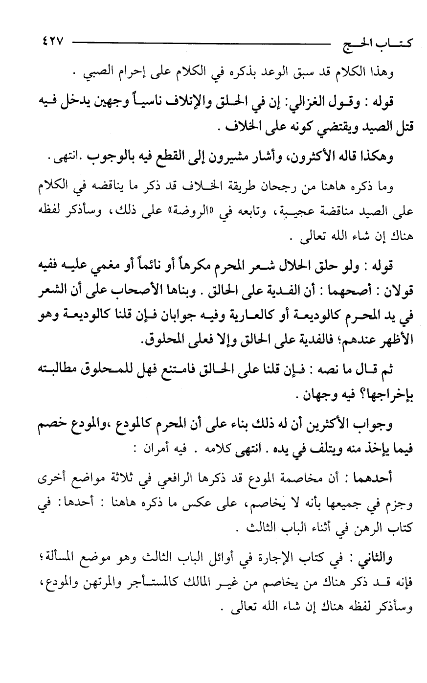 قوله: ولو حلق الحلال شعر المحرم مكرهًا أو نائمًا أو مغمي عليه ففيه قولان: أصحهما: أن الفدية على الحالق. وبناها الأصحاب على أن الشعر في يد المحرم كالوديعة أو كالعارية وفيه جوابان فإن قلنا كالوديعة وهو الأظهر عندهم؛ فالفدية على الحالق وإلا فعلى المحلوق.