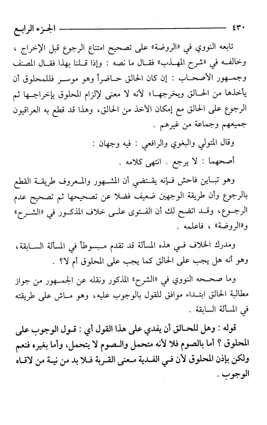 وهو تباين فاحش فإنه يقتضي أن المشهور والمعروف طريقة القطع بالرجوع وأن طريقة الوجهين ضعيف فضلا عن تصحيحها ثم تصحيح عدم الرجوع، وقد اتضح لك أن الفتوى على خلاف المذكور في "الشرح" و"الروضة"، فاعلمه.