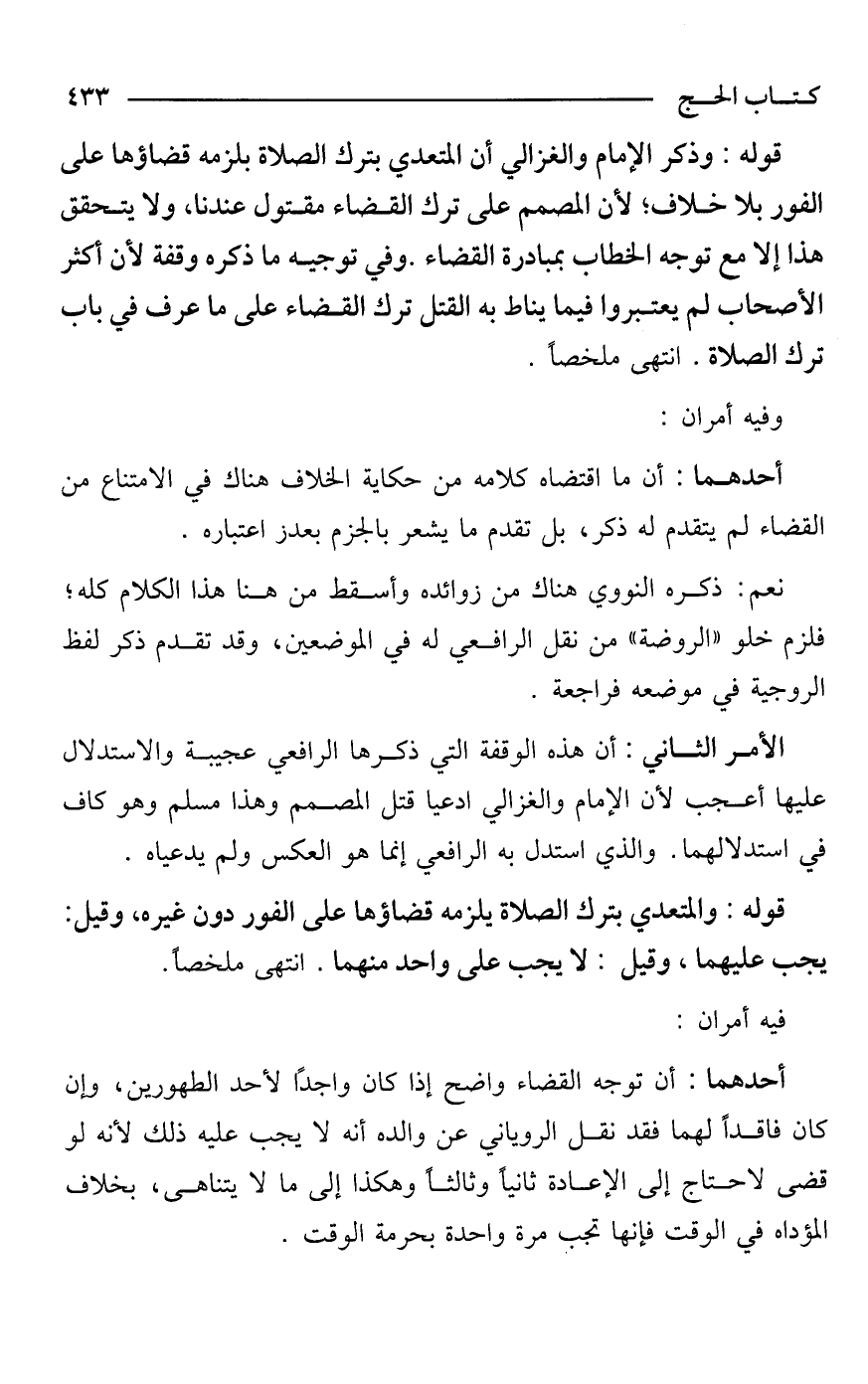 قوله: وذكر الإمام والغزالي أن المتعدي بترك الصلاة بلزمه قضاؤها على الفور بلا خلاف؛ لأن المصمم على ترك القضاء مقتول عندنا، ولا يتحقق هذا إلا مع توجه الخطاب بمبادرة القضاء. وفي توجيه ما ذكره وقفة لأن أكثر الأصحاب لم يعتبروا فيما يناط به القتل ترك القضاء على ما عرف في باب ترك الصلاة. انتهى ملخصًا.