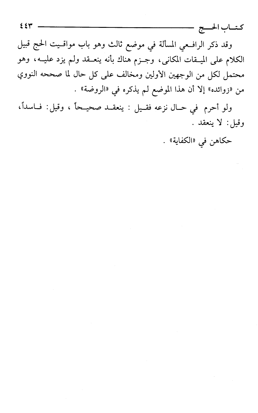 وقد ذكر الرافعي المسألة في موضع ثالث وهو باب مواقيت الحج قبيل الكلام على الميقات المكانى، وجزم هناك بأنه ينعقد ولم يزد عليه، وهو محتمل لكل من الوجهين الأولين ومخالف على كل حال لما صححه النووي من "زوائده" إلا أن هذا الموضع لم يذكره في "الروضة".