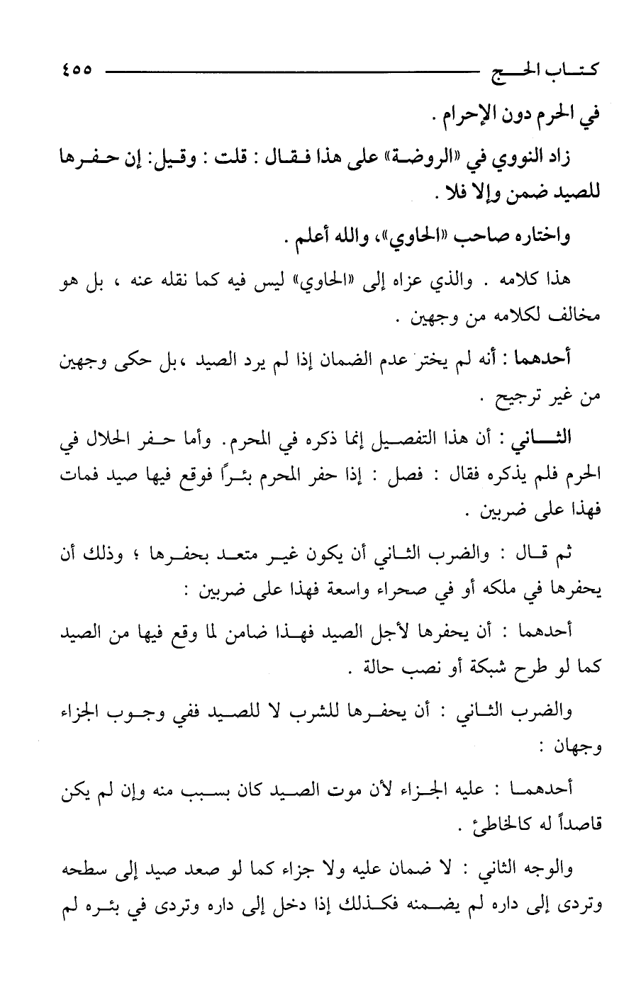 الثاني: أن هذا التفصيل إنما ذكره في المحرم. وأما حفر الحلال في الحرم فلم يذكره فقال: فصل: إذا حفر المحرم بئرًا فوقع فيها صيد فمات فهذا على ضربين.
