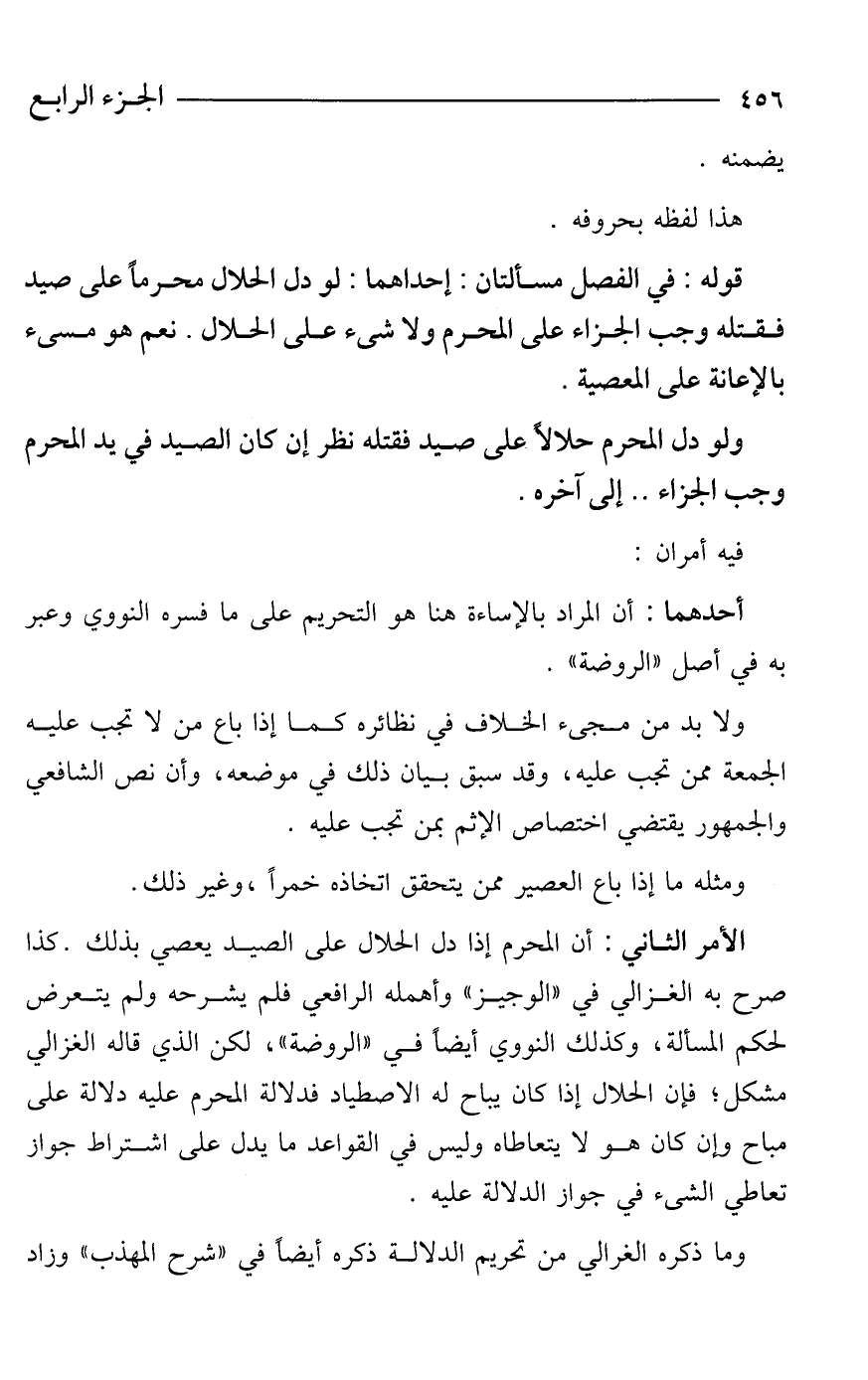 قوله: في الفصل مسألتان: إحداهما: لو دل الحلال محرمًا على صيد فقتله وجب الجزاء على المحرم ولا شئ على الحلال. نعم هو مسئ بالإعانة على المعصية.