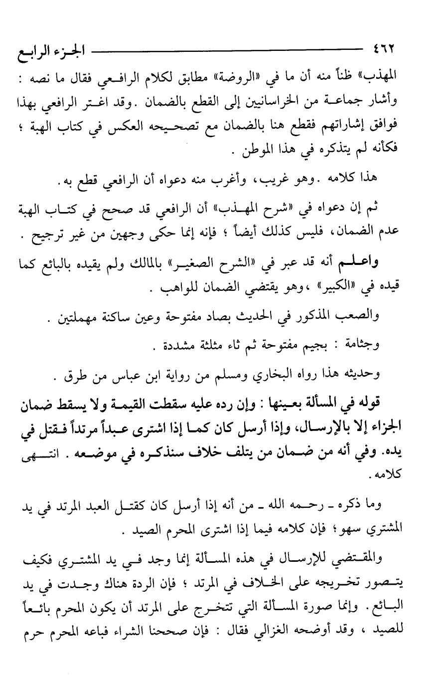 المهذب" ظنًا منه أن ما في "الروضة" مطابق لكلام الرافعي فقال ما نصه: وأشار جماعة من الخراسانيين إلى القطع بالضمان. وقد اغتر الرافعي بهذا فوافق إشاراتهم فقطع هنا بالضمان مع تصحيحه العكس في كتاب الهبة؛ فكأنه لم يتذكره في هذا الموطن.