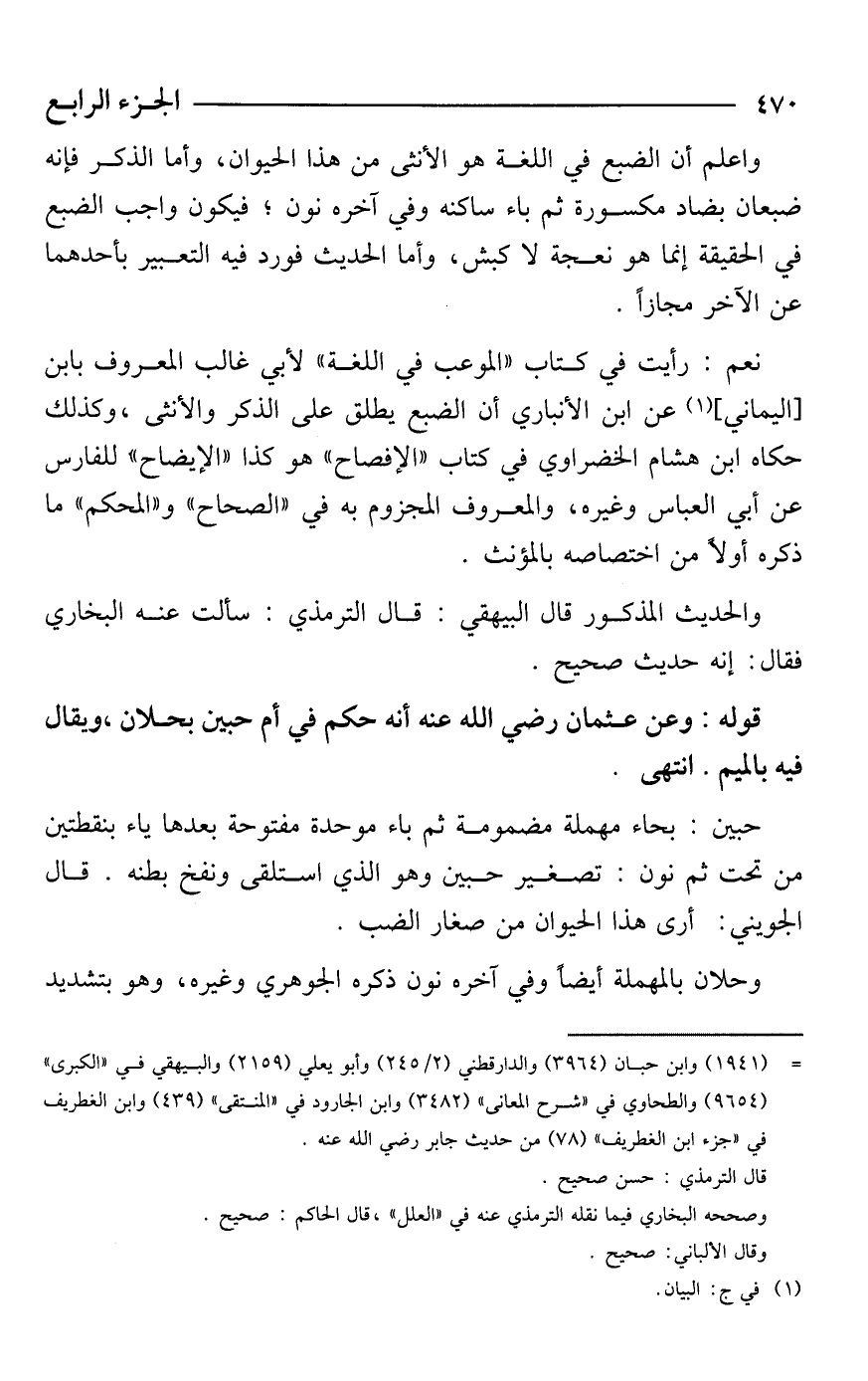واعلم أن الضبع في اللغة هو الأنثى من هذا الحيوان، وأما الذكر فإنه ضبعان بضاد مكسورة ثم باء ساكنه وفي آخره نون؛ فيكون واجب الضبع في الحقيقة إنما هو نعجة لا كبش، وأما الحديث فورد فيه التعبير بأحدهما عن الآخر مجازًا.