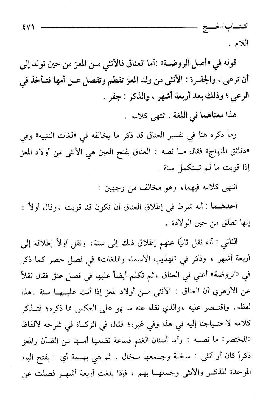 وما ذكره هنا في تفسير العناق قد ذكر ما يخالفه في "لغات التنبيه" وفي "دقائق المنهاج" فقال ما نصه: العناق بفتح العين هي الأنثى من أولاد المعز إذا قويت ما لم تستكمل سنة.