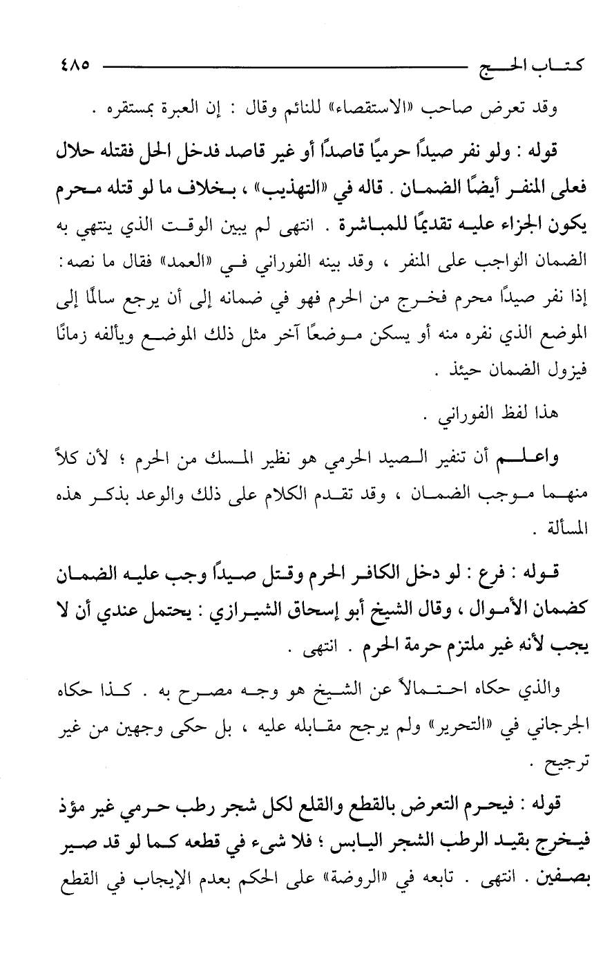 قوله: فرع: لو دخل الكافر الحرم وقتل صيدًا وجب عليه الضمان كضمان الأموال، وقال الشيخ أبو إسحاق الشيرازي: يحتمل عندي أن لا يجب لأنه غير ملتزم حرمة الحرم. انتهى.