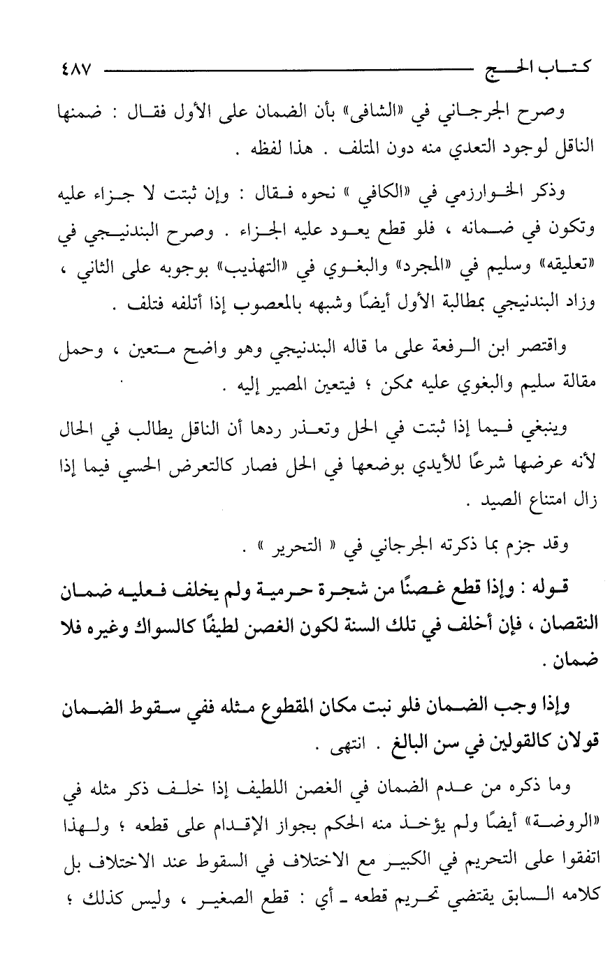 قوله: وإذا قطع غصنًا من شجرة حرمية ولم يخلف فعليه ضمان النقصان، فإن أخلف في تلك السنة لكون الغصن لطيفًا كالسواك وغيره فلا ضمان.