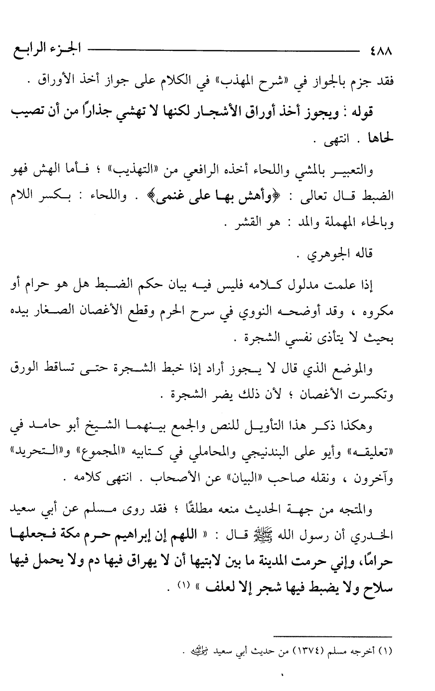 إذا علمت مدلول كلامه فليس فيه بيان حكم الضبط هل هو حرام أو مكروه، وقد أوضحه النووي في سرح الحرم وقطع الأغصان الصغار بيده بحيث لا يتأذى نفسي الشجرة.