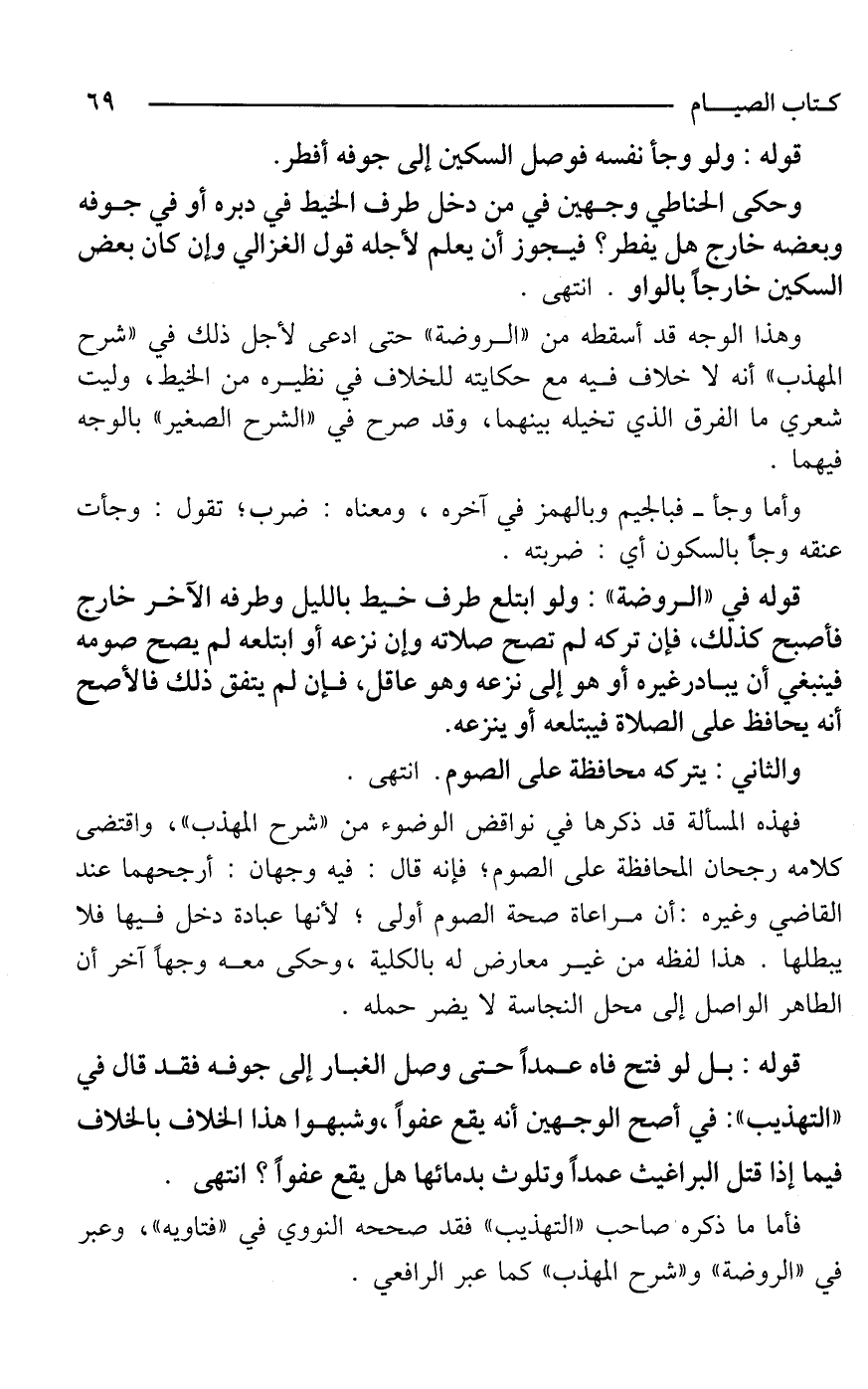 وحكى الحناطي وجهين في من دخل طرف الخيط في دبره أو في جوفه وبعضه خارج هل يفطر؟ فيجوز أن يعلم لأجله قول الغزالي وإن كان بعض السكين خارجًا بالواو. انتهى.
