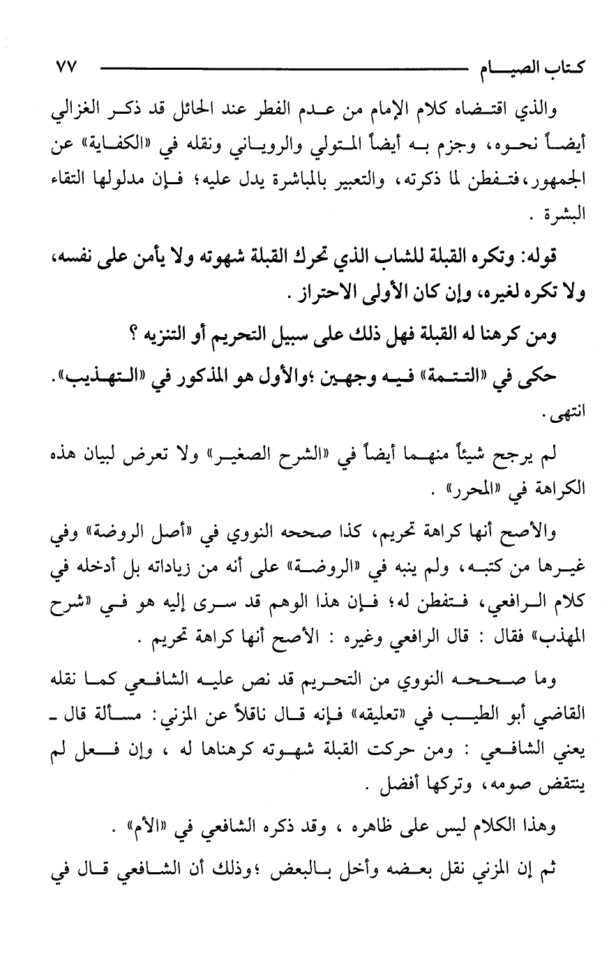 وما صححه النووي من التحريم قد نص عليه الشافعي كما نقله القاضي أبو الطيب في "تعليقه" فإنه قال ناقلًا عن المزني: مسألة قال -يعني الشافعي: ومن حركت القبلة شهوته كرهناها له، وإن فعل لم ينتقض صومه، وتركها أفضل.