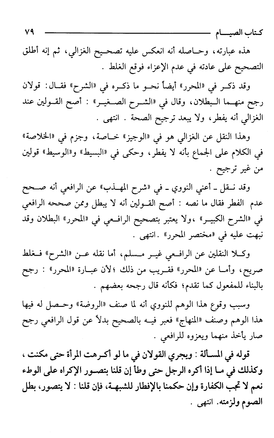 وقد نقل -أعني النووي- في "شرح المهذب" عن الرافعي أنه صحح عدم الفطر فقال ما نصه: أصح القولين أنه لا يبطل وممن صححه الرافعي في "الشرح الكبير"، ولا يعتبر بتصحيح الرافعي في "المحرر" البطلان وقد نبهت عليه في "مختصر المحرر". انتهى.