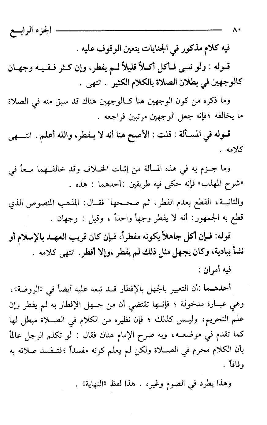 أحدهما: أن التعبير بالجهل بالإفطار قد تبعه عليه أيضًا في "الروضة"، وهي عبارة مدخولة؛ فإنها تقتضي أن من جهل الإفطار به لم يفطر وإن علم التحريم، وليس كذلك؛ فإن نظيره من الكلام في الصلاة مبطل لها كما تقدم في موضعه، وبه صرح الإمام هناك فقال: لو تكلم الرجل عالمًا بأن الكلام محرم في الصلاة ولكن لم يعلم كونه مفسدًا؛ فتفسد صلاته به وفاقًا.