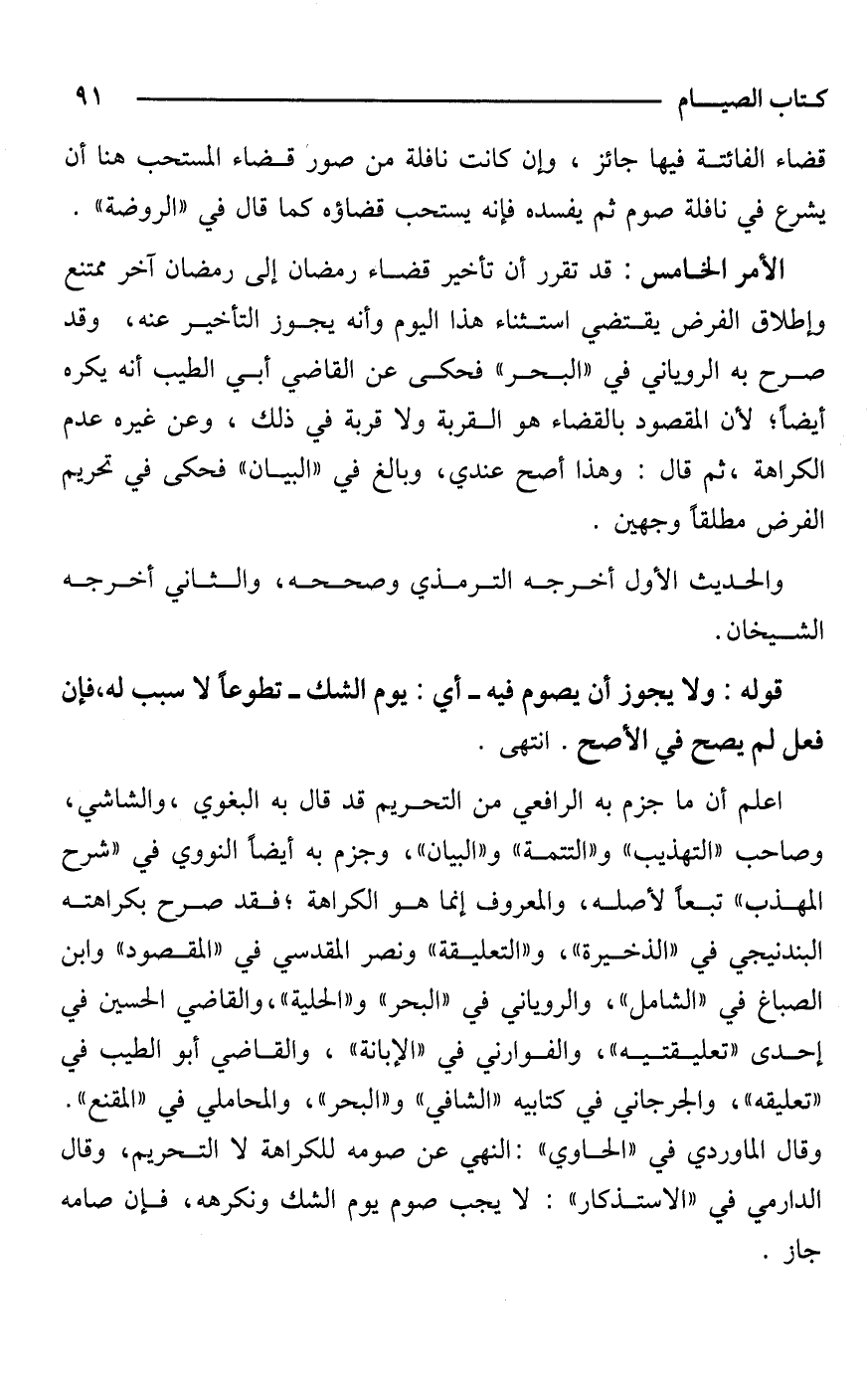الأمر الخامس: قد تقرر أن تأخير قضاء رمضان إلى رمضان آخر ممتنع وإطلاق الفرض يقتضي استثناء هذا اليوم وأنه يجوز التأخير عنه، وقد صرح به الروياني في "البحر" فحكى عن القاضي أبي الطيب أنه يكره أيضًا؛ لأن المقصود بالقضاء هو القربة ولا قربة في ذلك، وعن غيره عدم الكراهة، ثم قال: وهذا أصح عندي، وبالغ في "البيان" فحكى في تحريم الفرض مطلقًا وجهين.