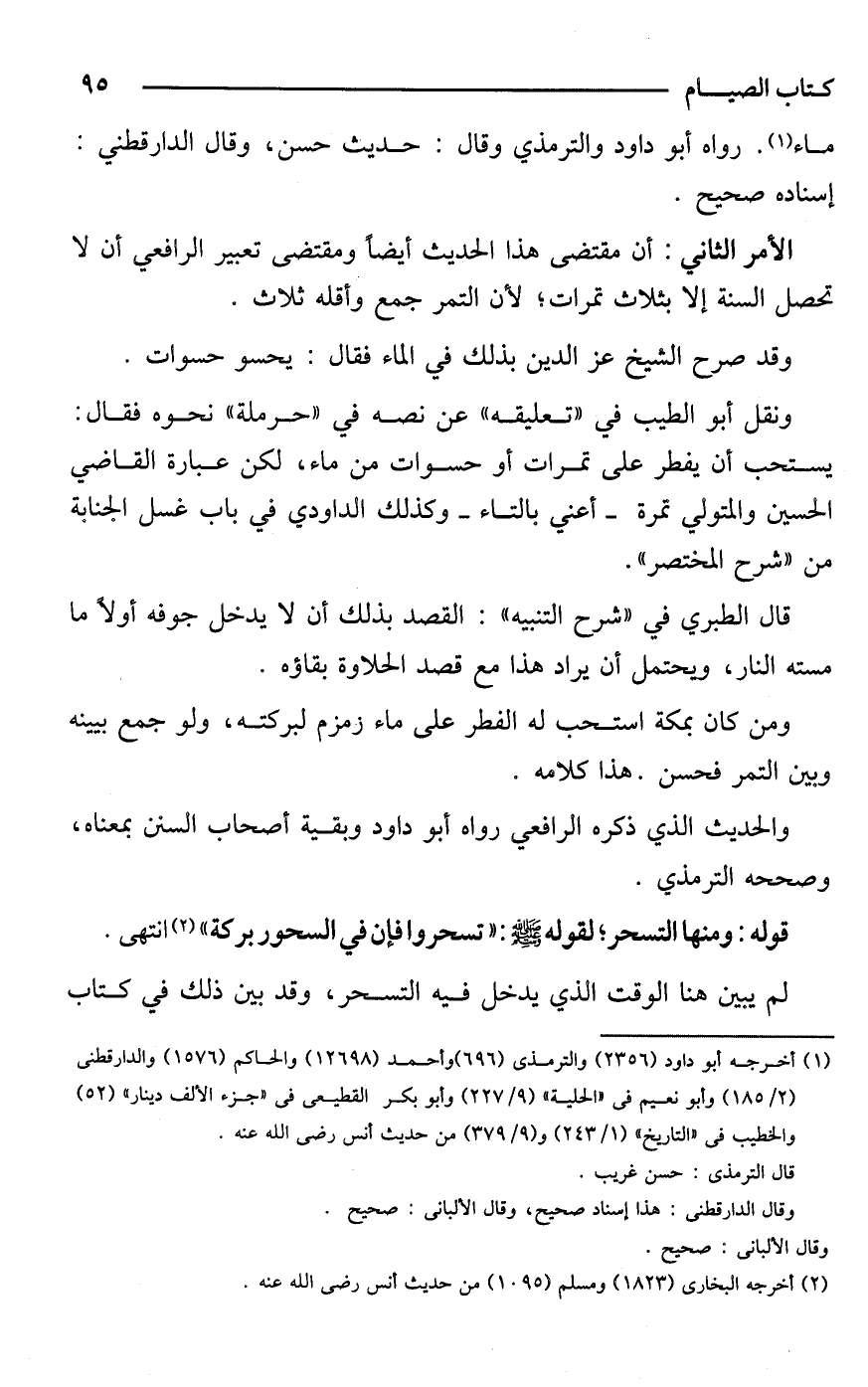 الأمر الثاني: أن مقتضى هذا الحديث أيضًا ومقتضى تعبير الرافعي أن لا تحصل السنة إلا بثلاث تمرات؛ لأن التمر جمع وأقله ثلاث.