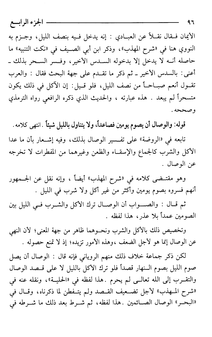 ثم قال: والصواب أن الوصال ترك الأكل والشرب في الليل بين الصومين عمدًا بلا عذر، هذا لفظه.