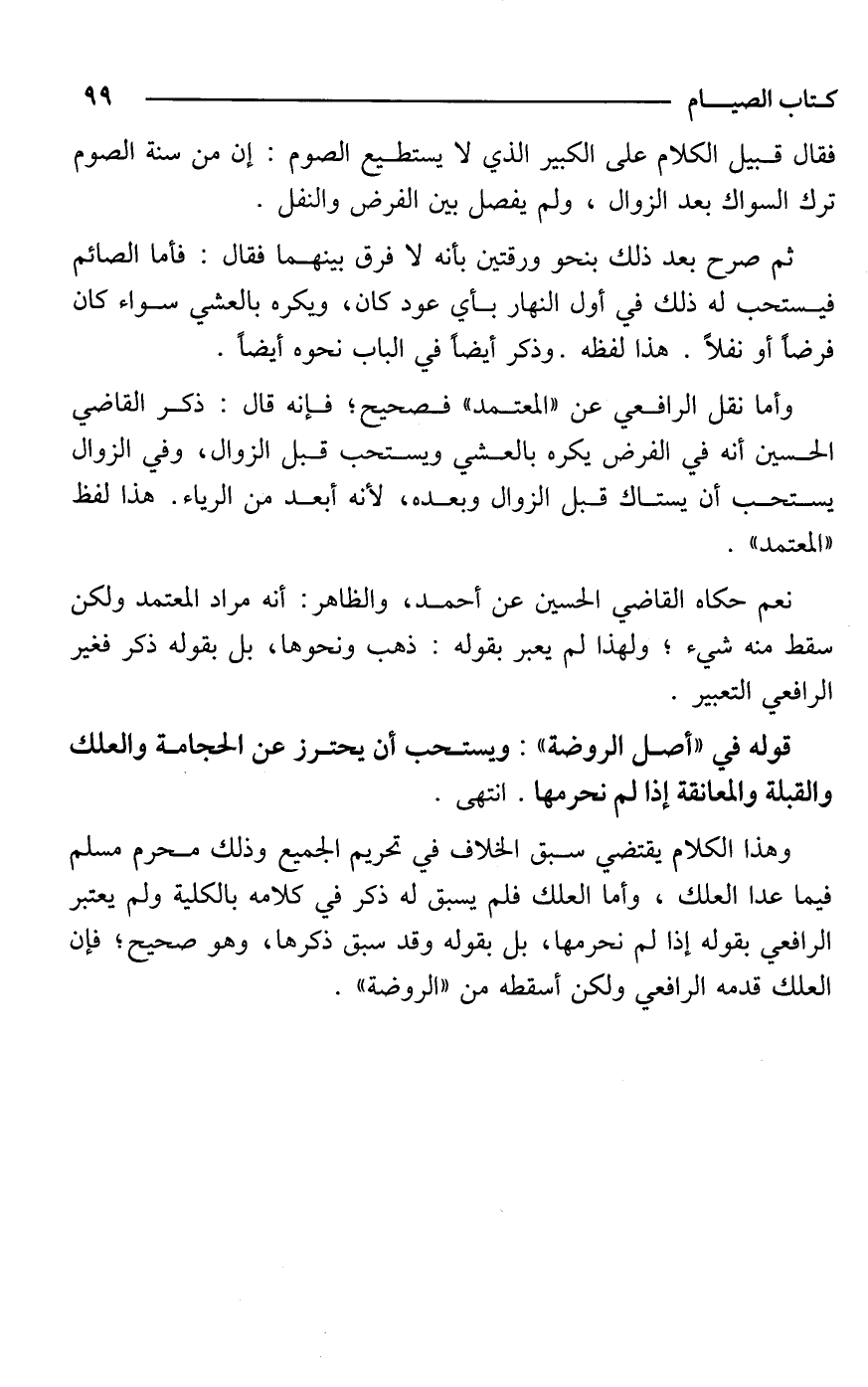 قوله في "أصل الروضة": ويستحب أن يحترز عن الحجامة والعلك والقبلة والمعانقة إذا لم نحرمها. انتهى.