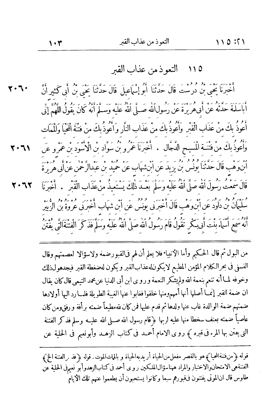 مِنَ الْبَوْلِ ثُمَّ قَالَ الْحَكِيمُ وَأَمَّا الْأَنْبِيَاءُ فَلَا يُعْلَمُ أَنَّ لَهُمْ فِي الْقُبُورِ ضَمَّةً وَلَا سُؤَالًا لِعِصْمَتِهِمْ وَقَالَ النَّسَفِيُّ فِي بَحْرِ الْكَلَامِ الْمُؤْمِنُ الْمُطِيعُ لَا يَكُونُ لَهُ عَذَابُ الْقَبْرِ وَيَكُونُ لَهُ ضَغْطَةُ الْقَبْرِ فَيَجِدُ هَوْلَ ذَلِكَ وَخَوْفَهُ لِمَا أَنَّهُ تَنَعَّمَ بِنِعْمَةِ اللَّهِ وَلم يشْكر النِّعْمَة وروى بن أَبِي الدُّنْيَا عَنْ مُحَمَّدٍ التَّيْمِيِّ قَالَ كَانَ يُقَالُ إِنَّ ضَمَّةَ الْقَبْرِ إِنَّمَا أَصْلُهَا أَنَّهَا أُمُّهُمْ وَمِنْهَا خُلِقُوا فَغَابُوا عَنْهَا الْغَيْبَةَ الطَّوِيلَةَ فَلَمَّا رُدَّ إِلَيْهَا أَوْلَادُهَا ضَمَّتْهُمْ ضَمَّةَ الْوَالدَةِ غَابَ عَنْهَا وَلَدُهَا ثُمَّ قَدِمَ عَلَيْهَا فَمَنْ كَانَ لِلَّهِ مُطِيعًا ضَمَّتْهُ بِرَأْفَةٍ وَرِفْقٍ وَمَنْ كَانَ عَاصِيًا ضَمَّتْهُ بِعُنْفٍ سَخَطًا مِنْهَا عَلَيْهِ لِرَبِّهَا قَامَ رَسُولُ اللَّهِ صَلَّى اللَّهُ عَلَيْهِ وَسَلَّمَ فَذَكَرَ الْفِتْنَةَ الَّتِي يُفْتَنُ بِهَا الْمَرْءُ فِي قَبْرِهِ رَوَى الْإِمَامُ أَحْمَدُ فِي كِتَابِ الزُّهْدِ وَأَبُو نُعَيْمٍ فِي الْحِلْيَةِ عَنْ